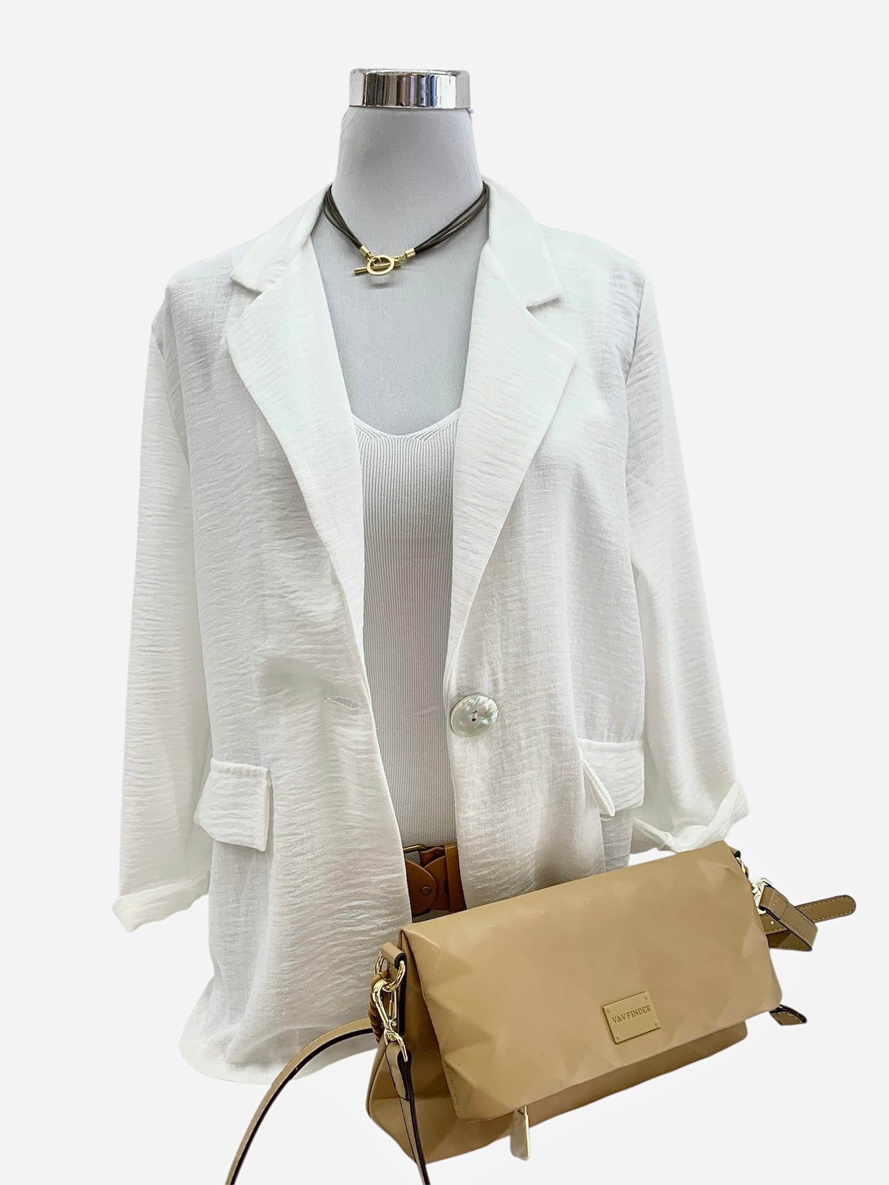 Americana ligera de corte oversize. Diseño largo con cuello clásico, cierre de un solo botón y manga larga. Incorpora una tapeta decorativa de bolsillo en la parte delantera. Acabado efecto lino que no se arruga.