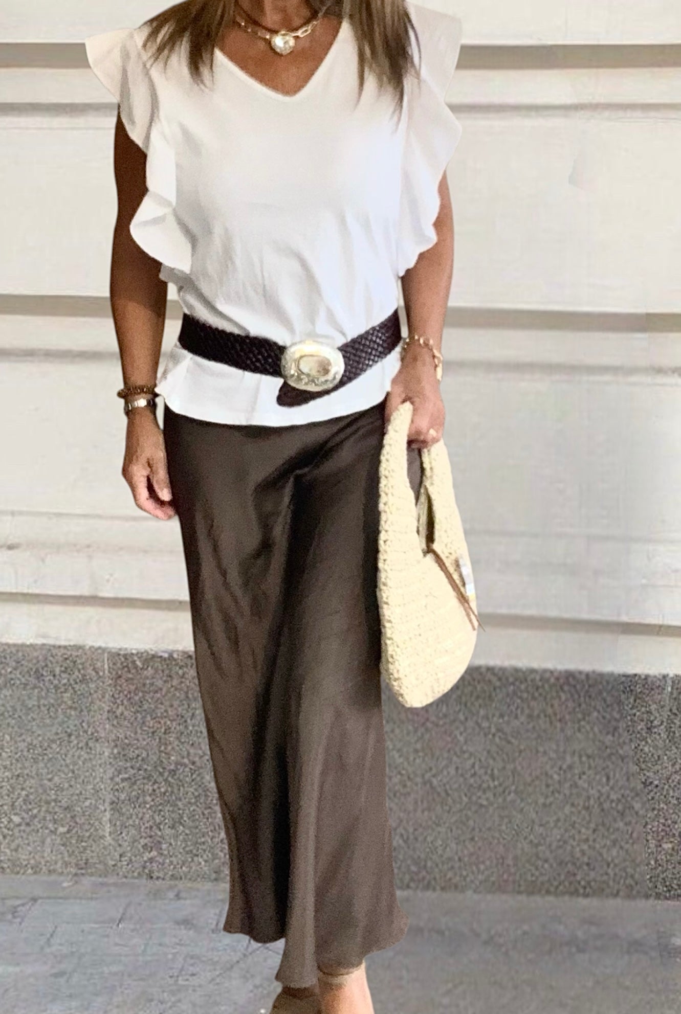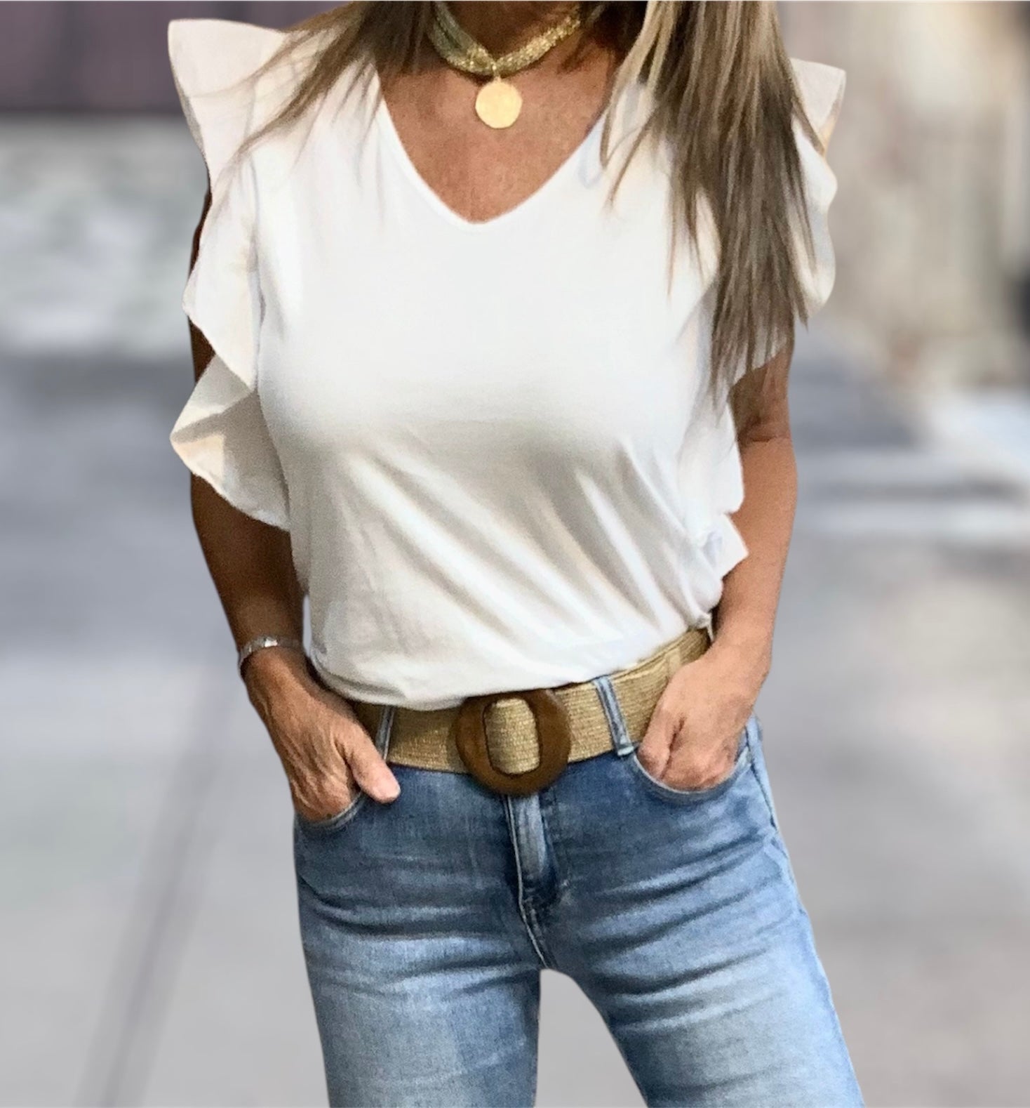 Camiseta de algodón suave con escote en pico y un delicado corte romántico. Presenta un volante sobrepuesto en los hombros que aporta movimiento y detalle al diseño.