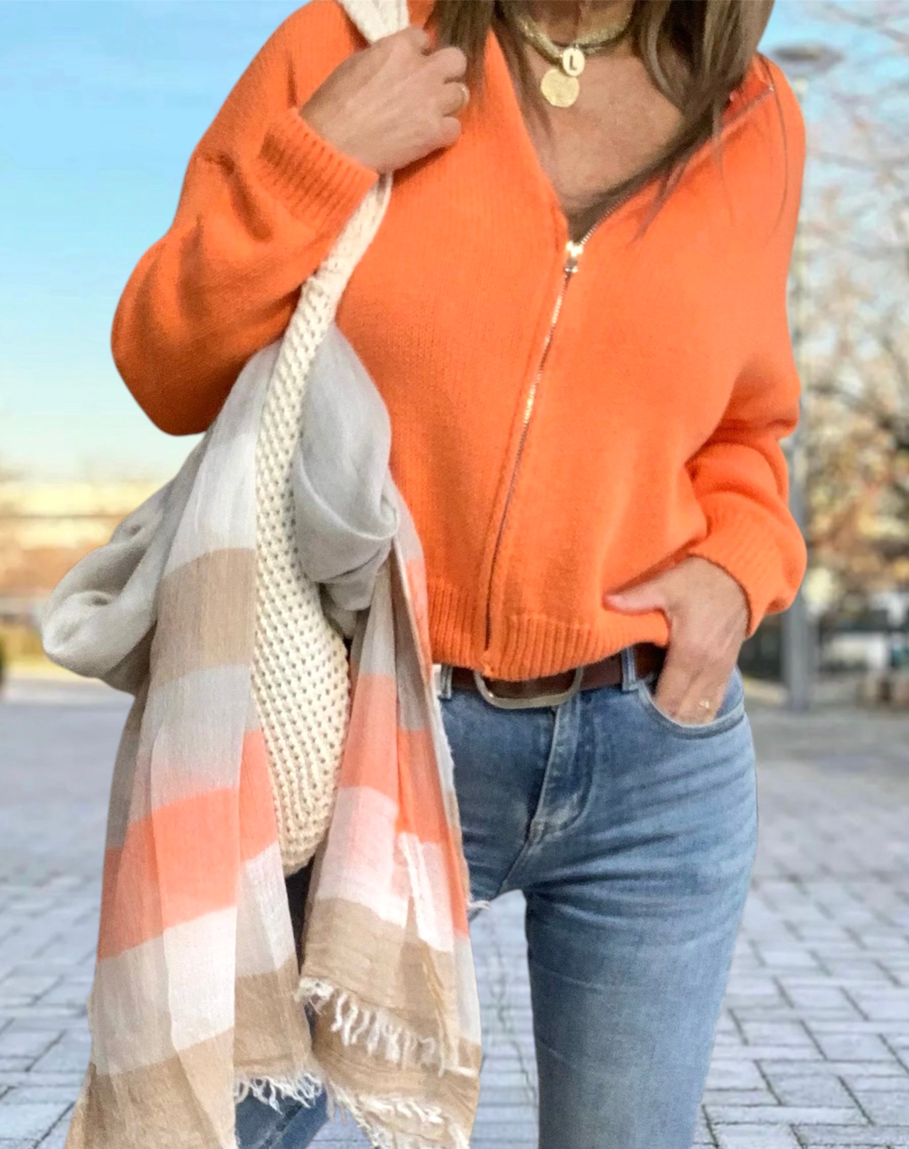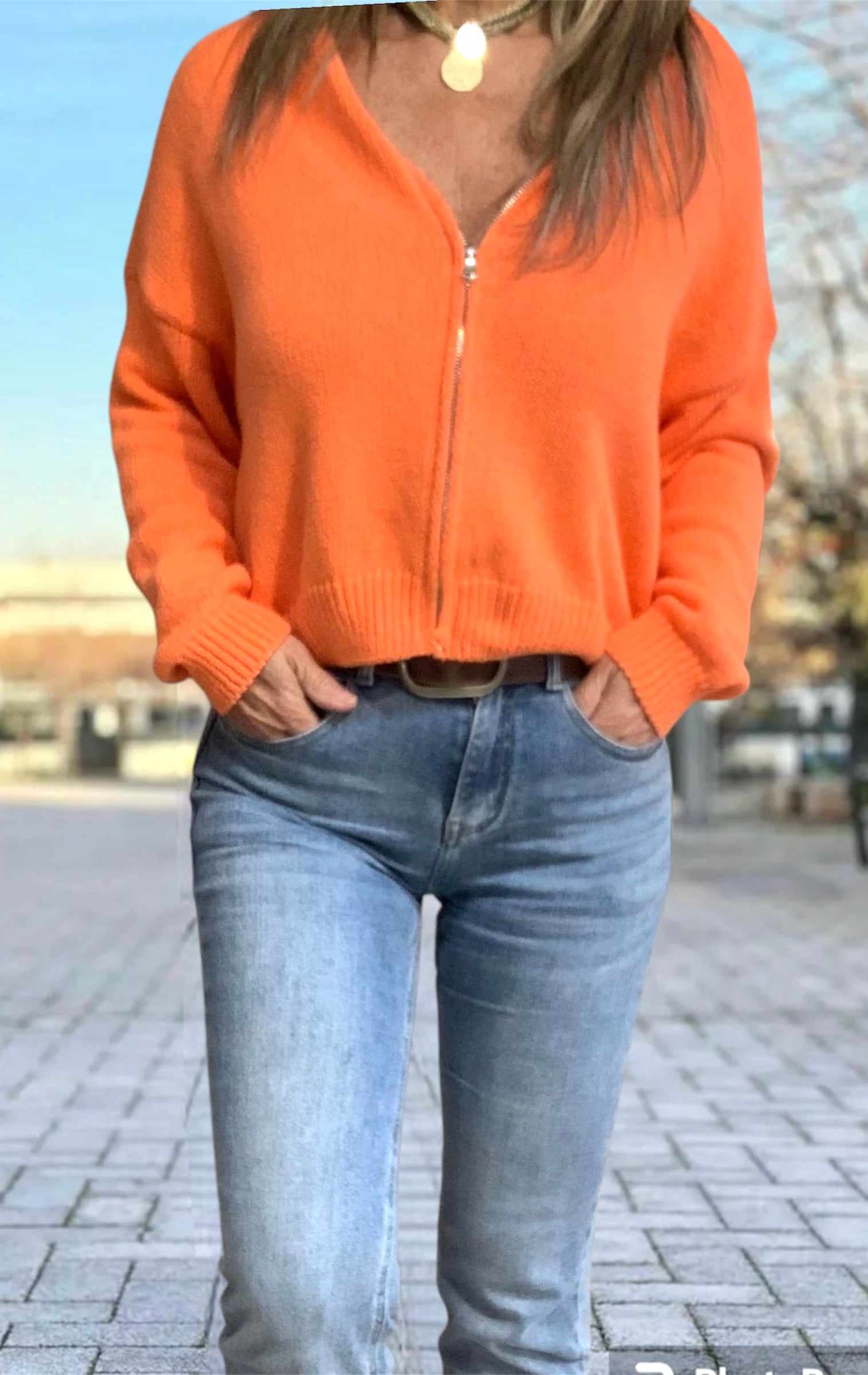 Cárdigan casual de algodón en color naranja intenso. Presenta un diseño cómodo con cremallera frontal, manga larga de caída suave y cuello redondo. Ideal para entretiempo o noches de verano.