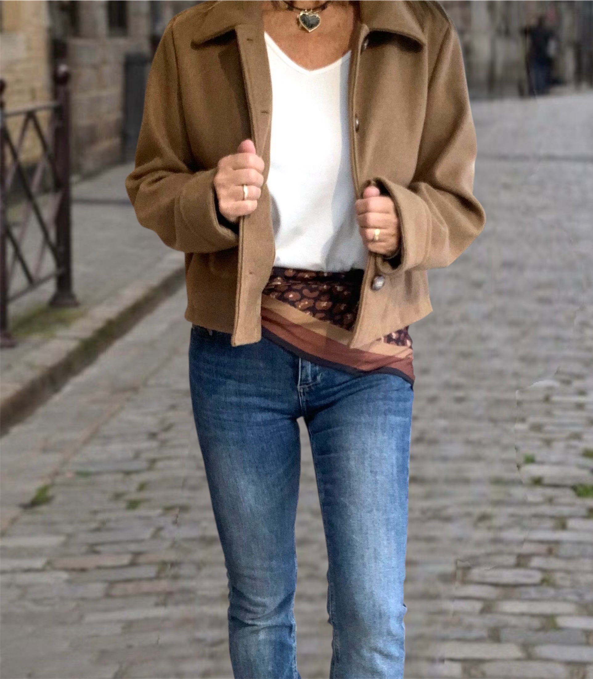 Chaqueta corta con cuello camisero, botones frontales y bolsillos frontales sobrepuestos.
