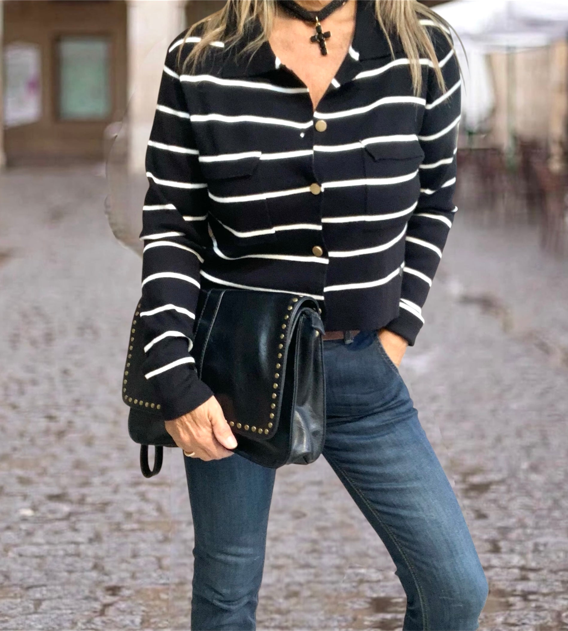 Chaqueta corta con estampado de rayas y cuello de punto camisero. Escote redondo, cierre con botones metálicos mate y bolsillos con tapeta. Manga montada