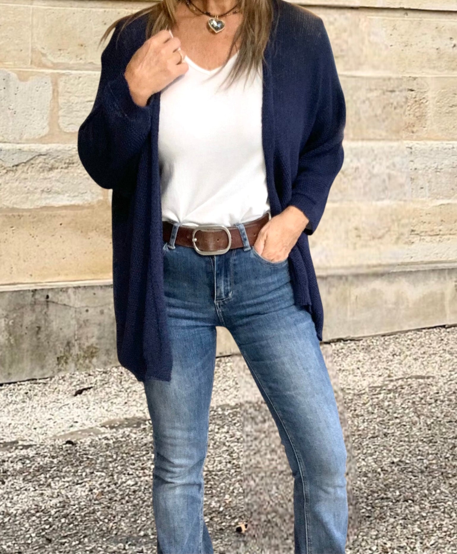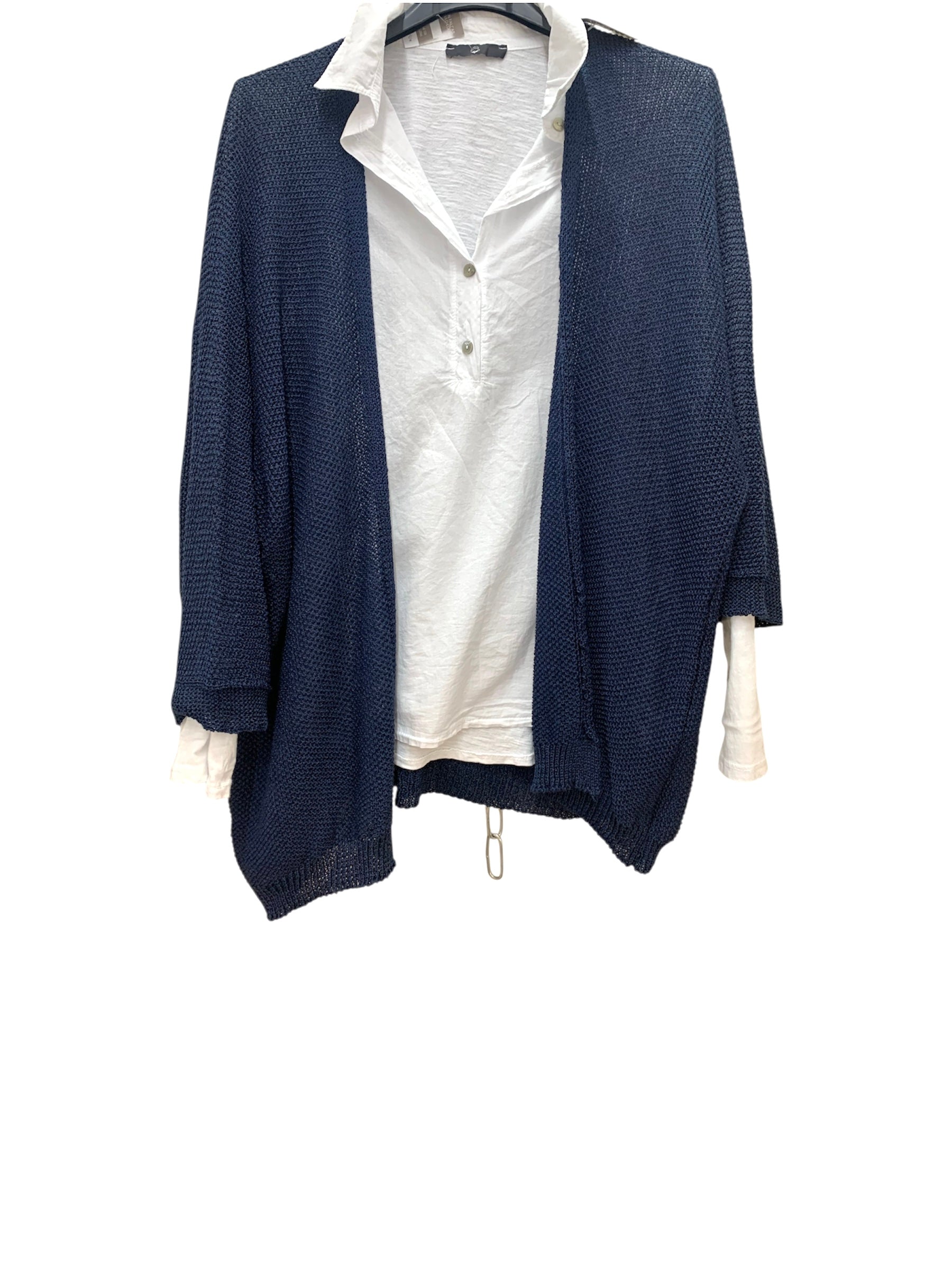 Chaqueta ligera de punto viscosa estilo kimono en color azul marino. Diseño abierto, manga ancha y caída fluida. Ideal entretiempo