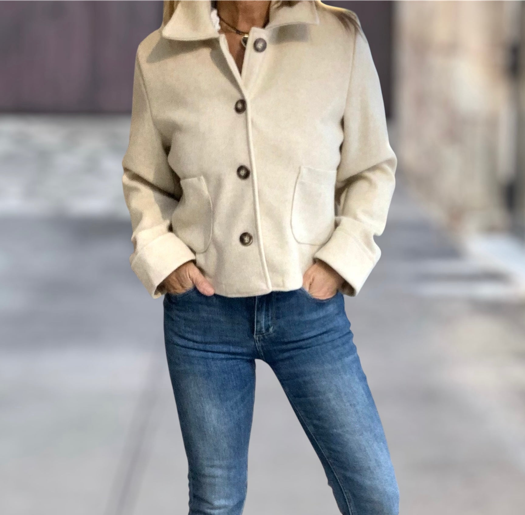 Chaqueta corta con cuello camisero, botones frontales y bolsillos frontales sobrepuestos.