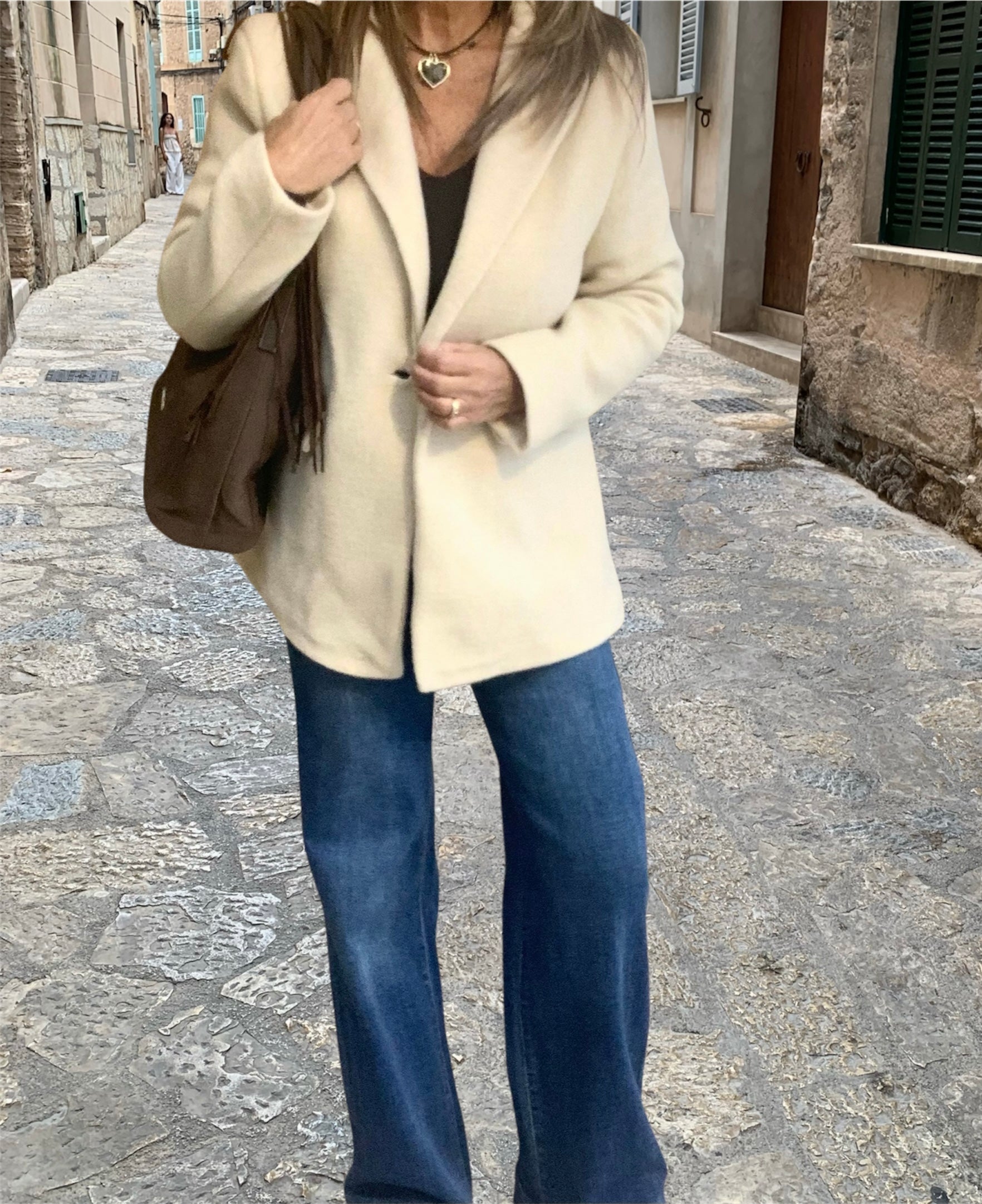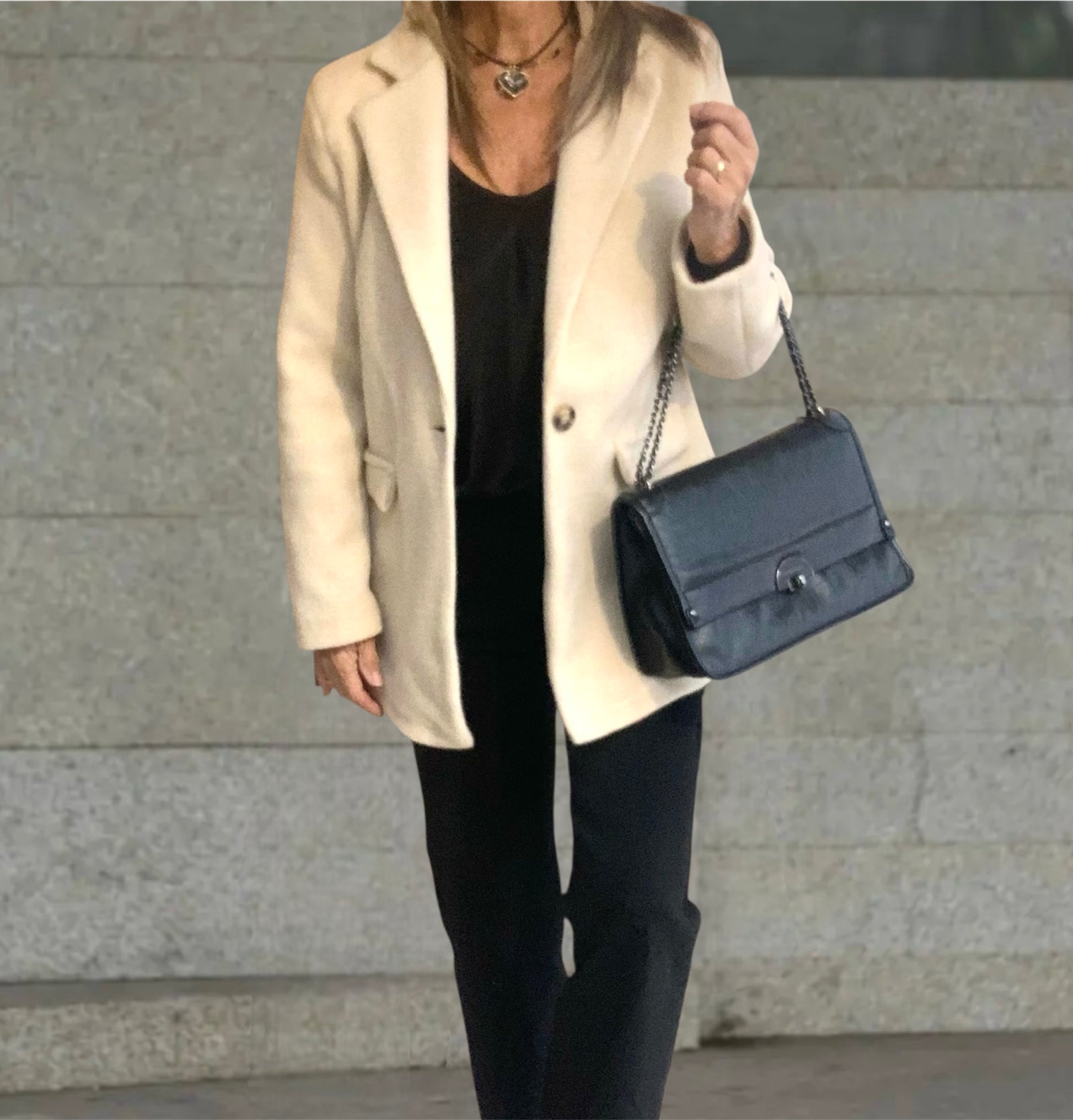Abrigo corto de paño con cuello de solapa clásica y cierre con un botón. Tapetas decorativas simulando bolsillos. Diseño de corte recto y ligero, con manga larga montada. Forro interior.