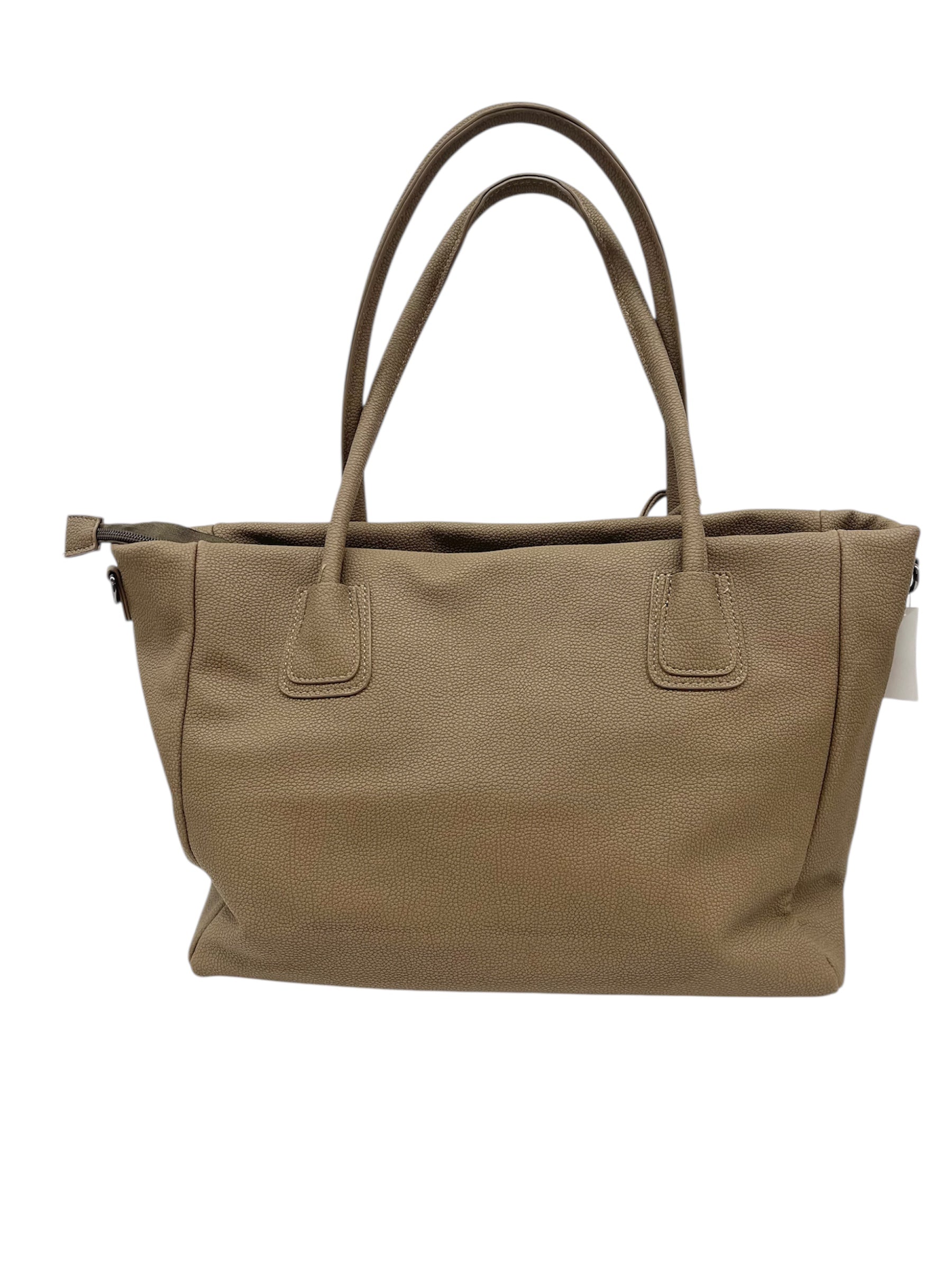 Bolso de polipiel, en tono taupe, de textura suave. Lleva dos asas cortas y un adorno de flecos en el frente. Incluye asa larga adicional para llevar al hombro o cruzado. Cierre con cremallera y interior amplio.