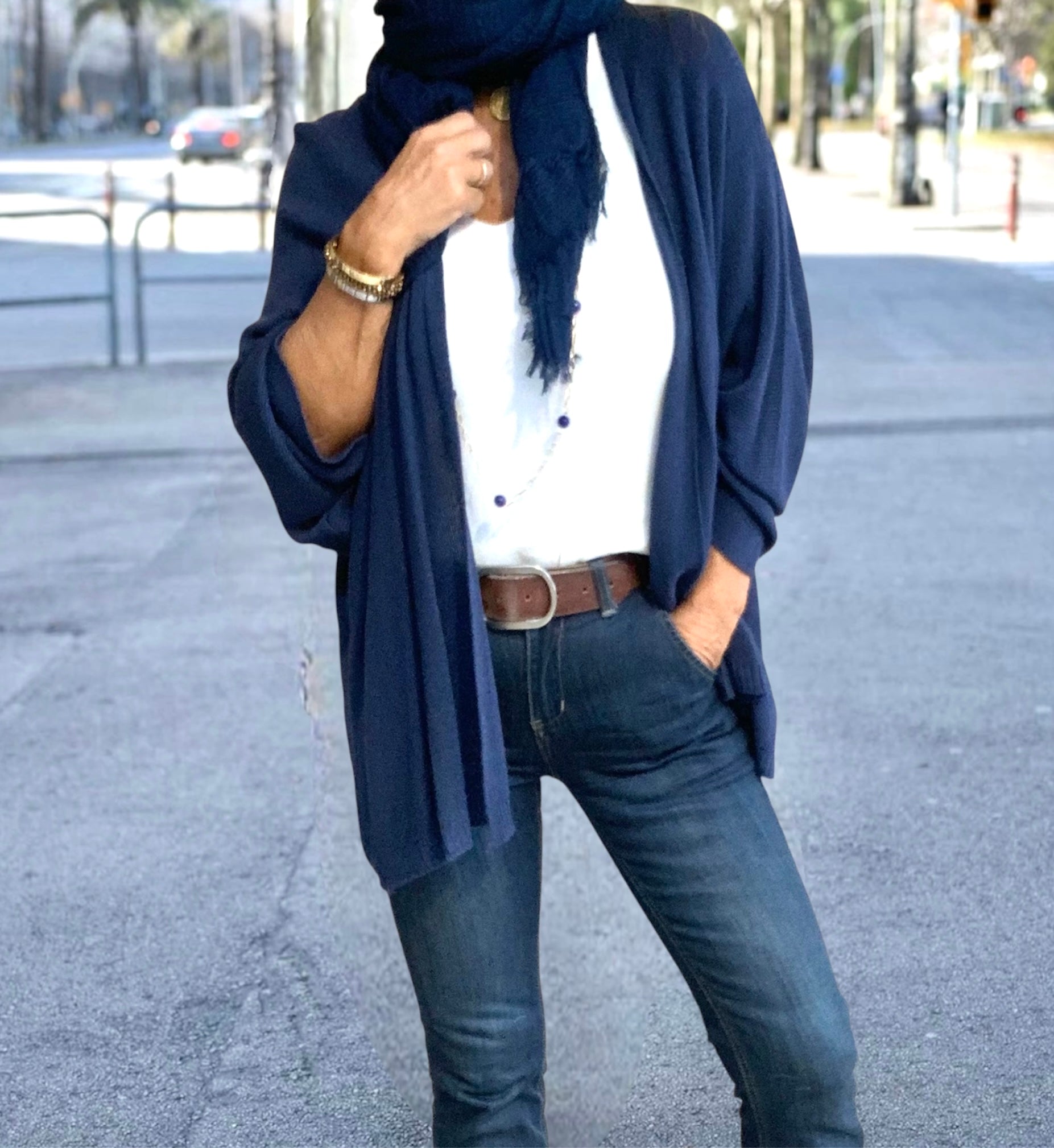 Chaqueta ligera de punto estilo kimono en color azul marino. Diseño abierto, manga ancha y caída fluida.