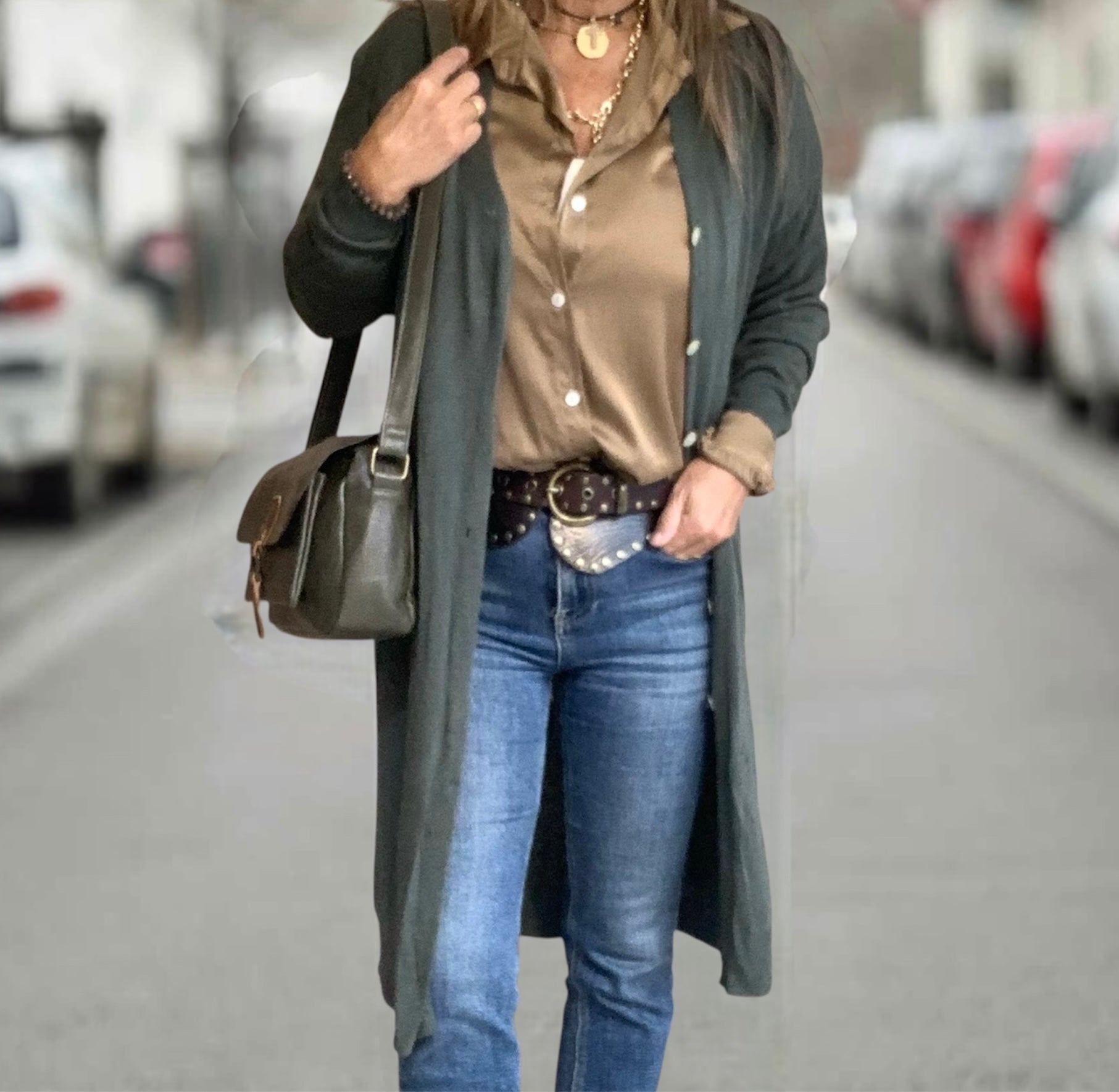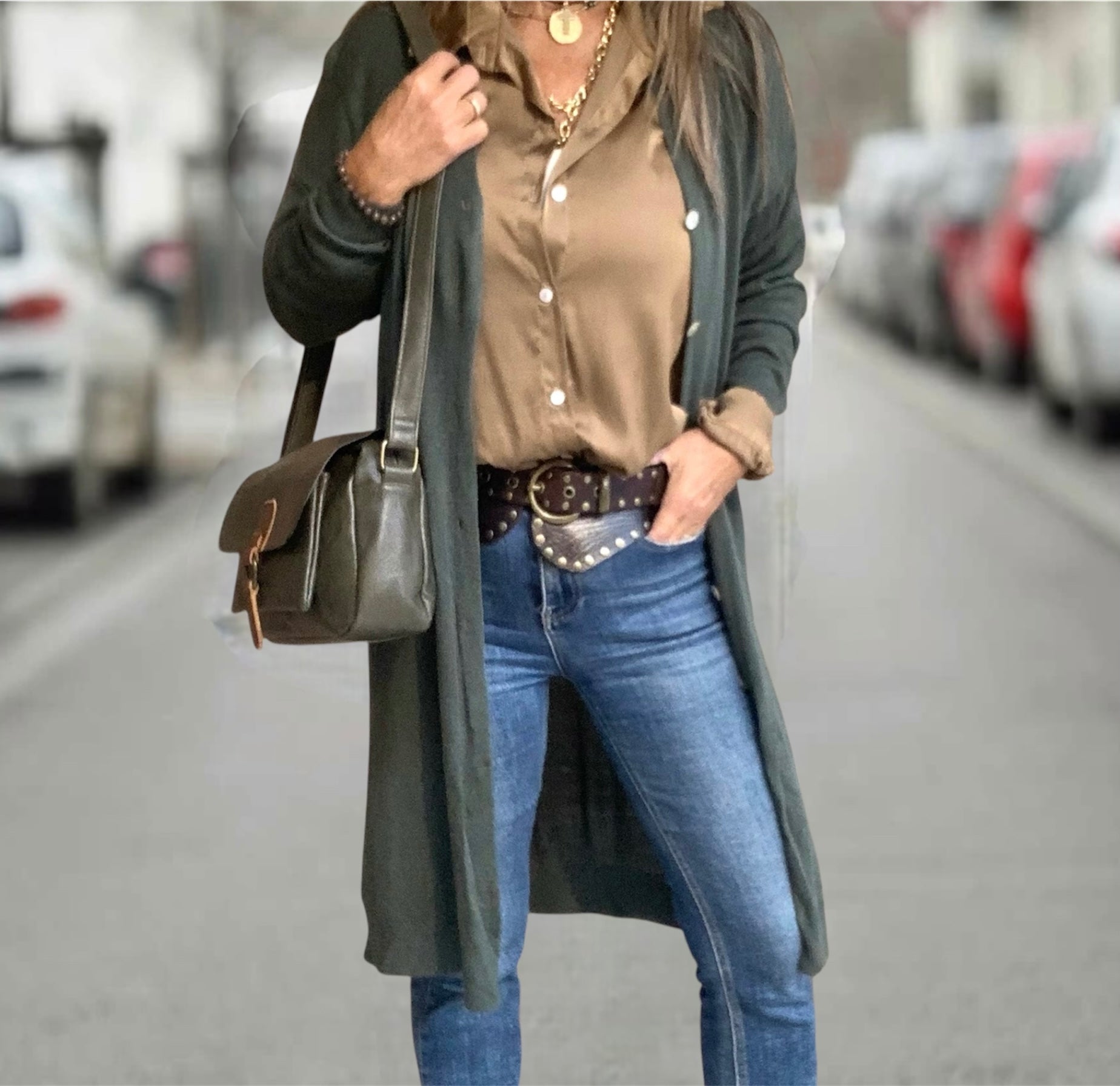 Chaqueta de punto en color verde con diseño largo y botones frontales.Manga larga montada