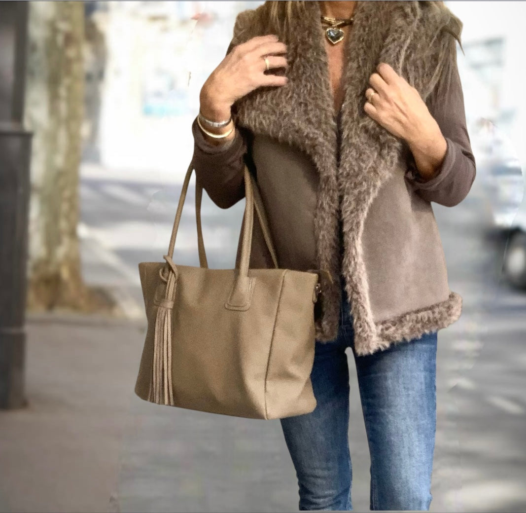 Chaleco beige con interior de borreguito suave y solapas amplias diseño abierto sin cierre corte recto y cómodo ideal para superponer sobre camisetas o jerseys.