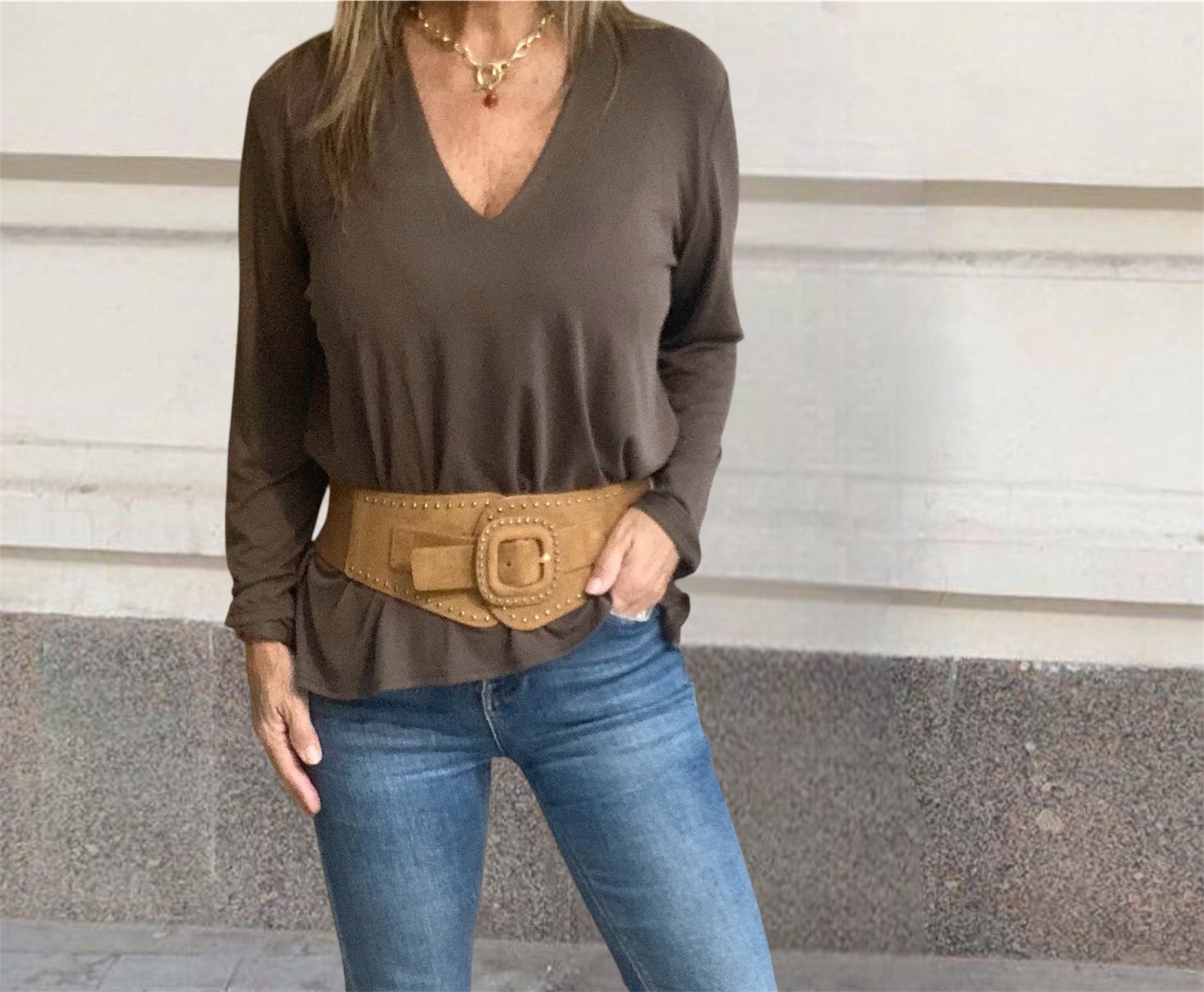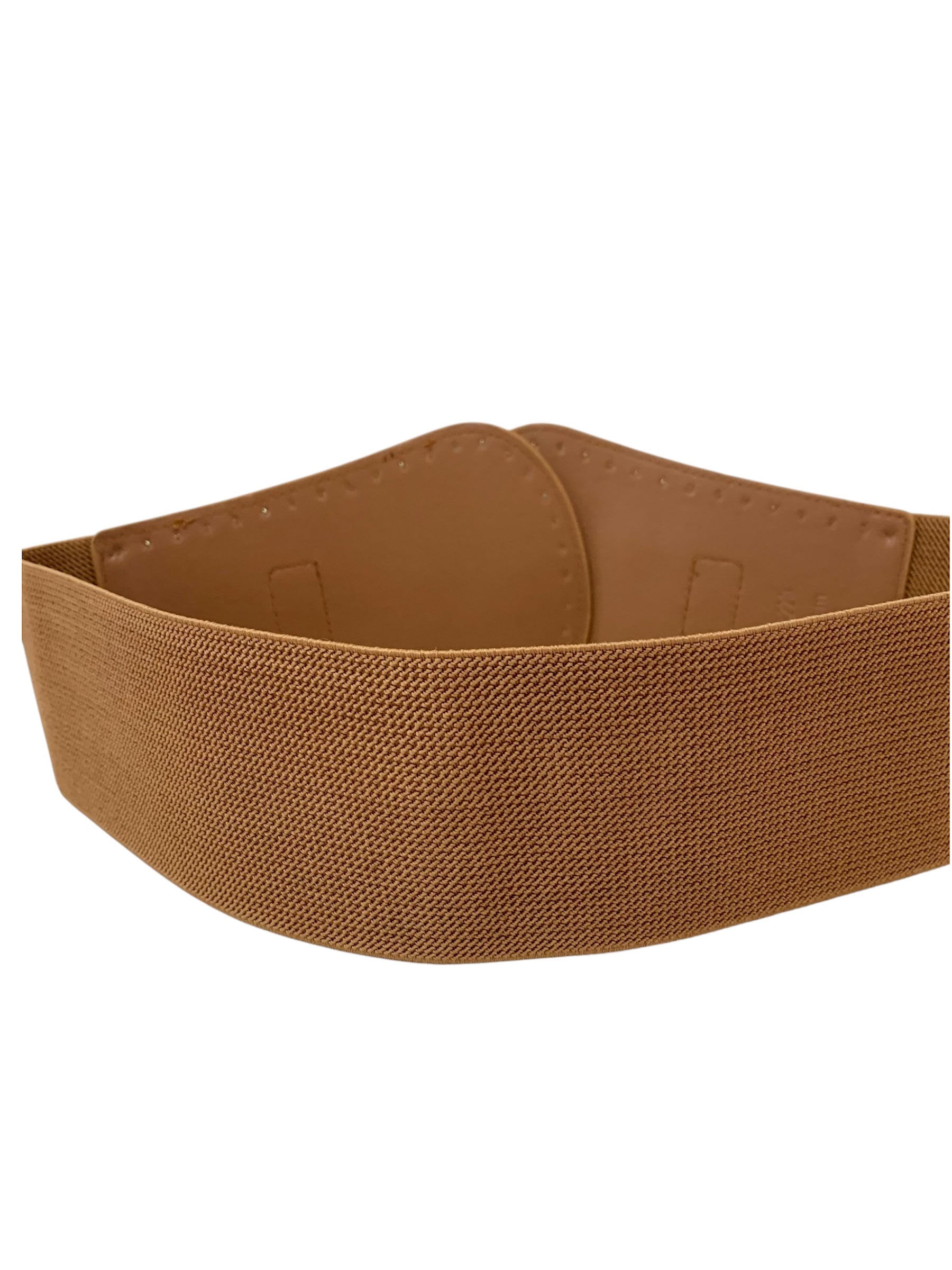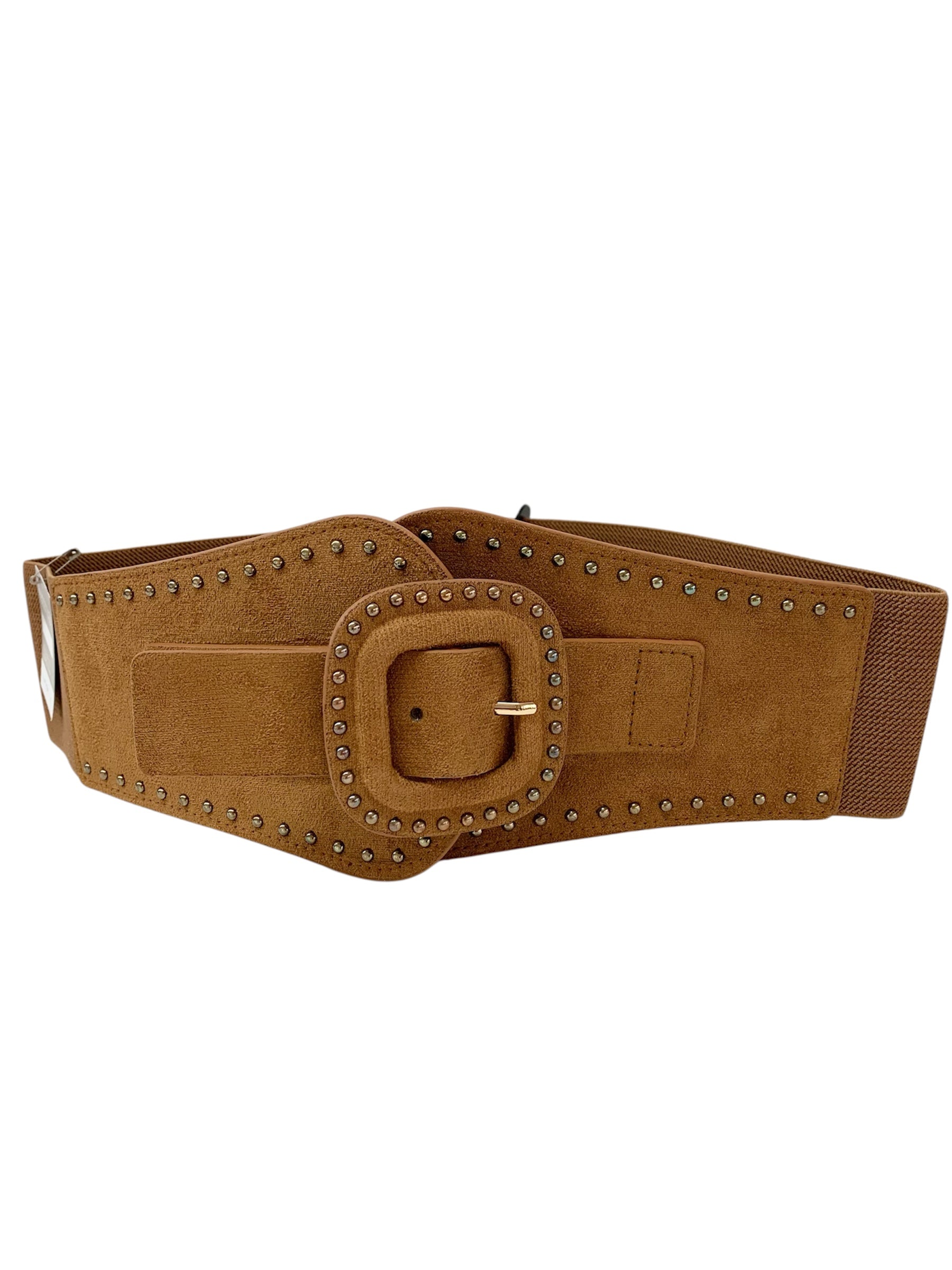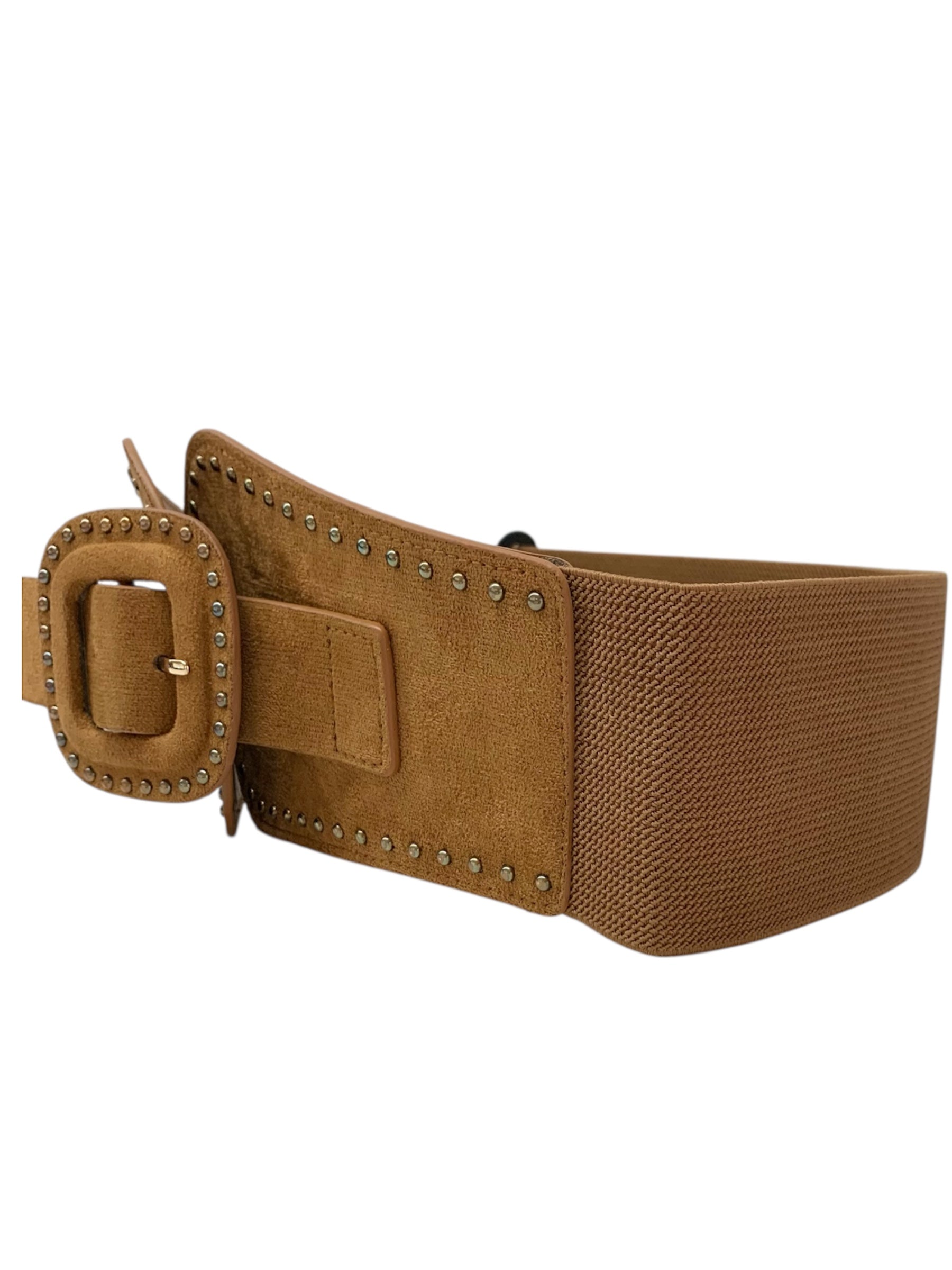 Cinturón ancho en color camel con efecto ante y detalle de pequeñas tachuelas metálicas. Hebilla forrada a tono y parte trasera elástica para un ajuste perfecto y cómodo