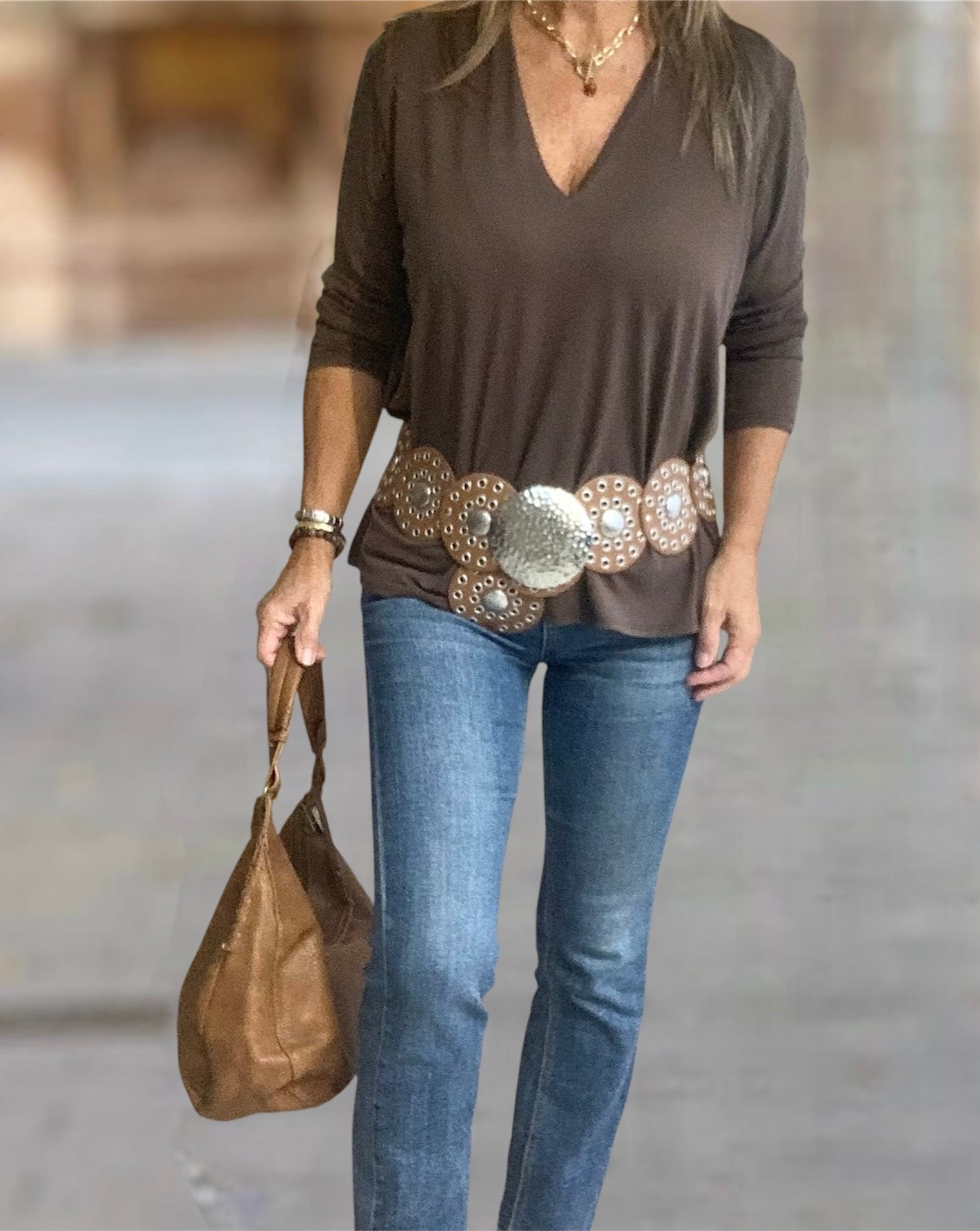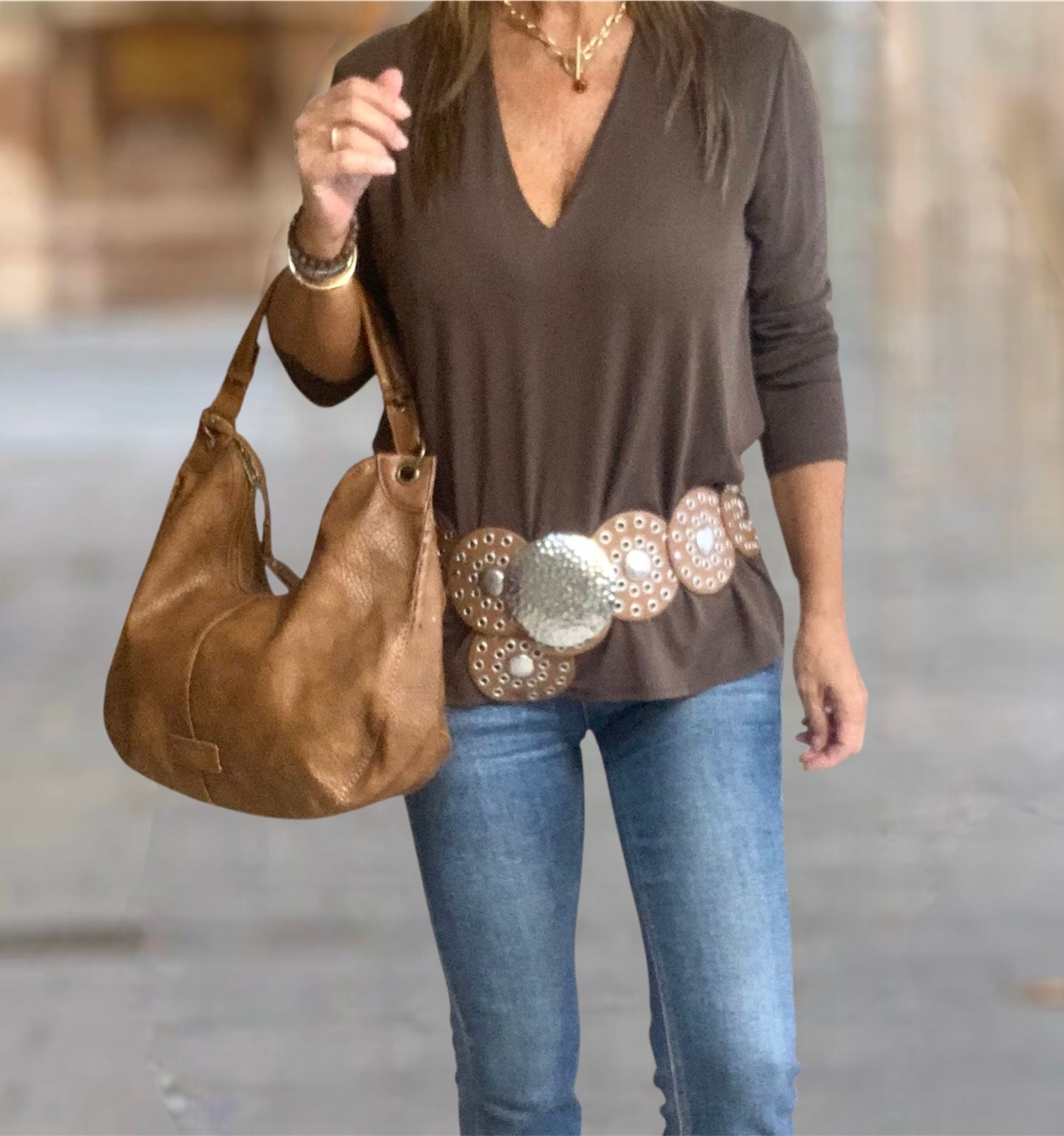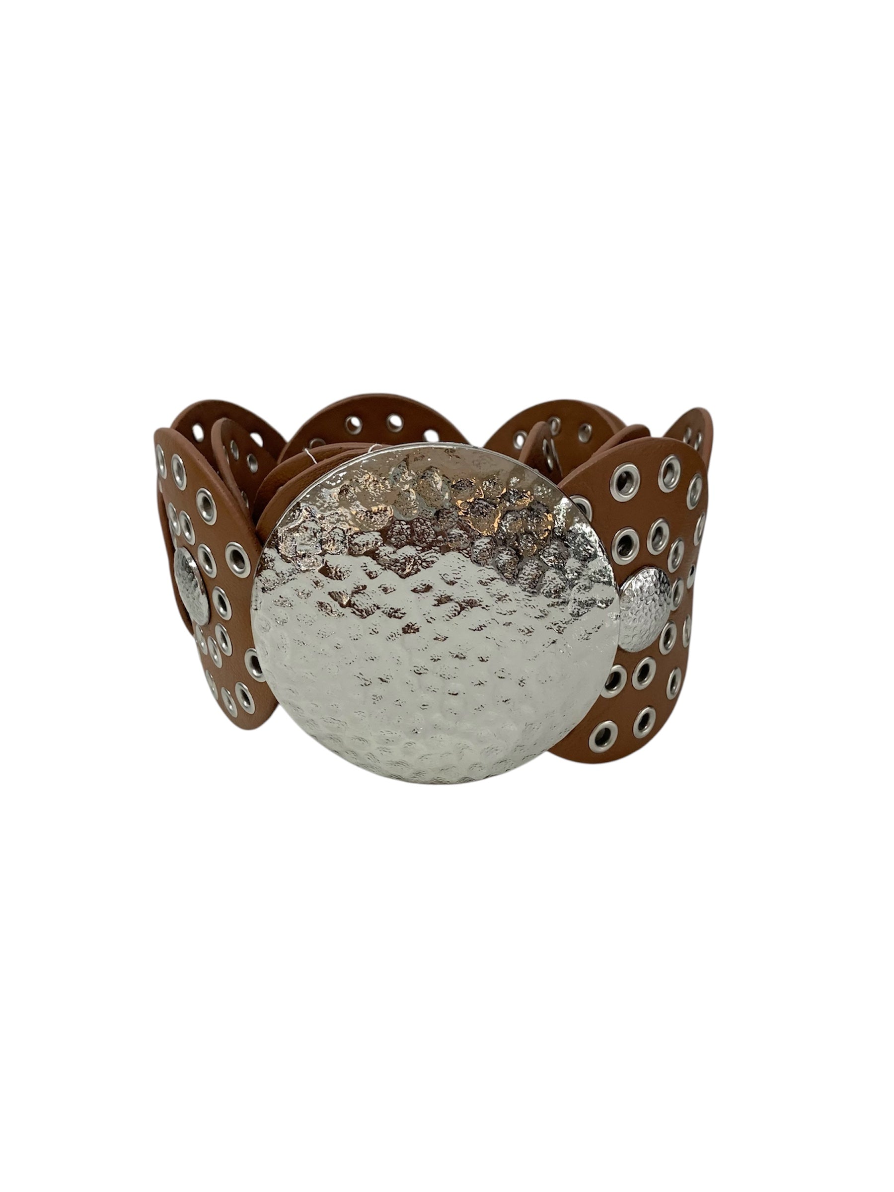 Cinturón ancho de polipiel hecho de discos unidos entre sí con detalles metálicos. Cierre de disco grande central metalizado.