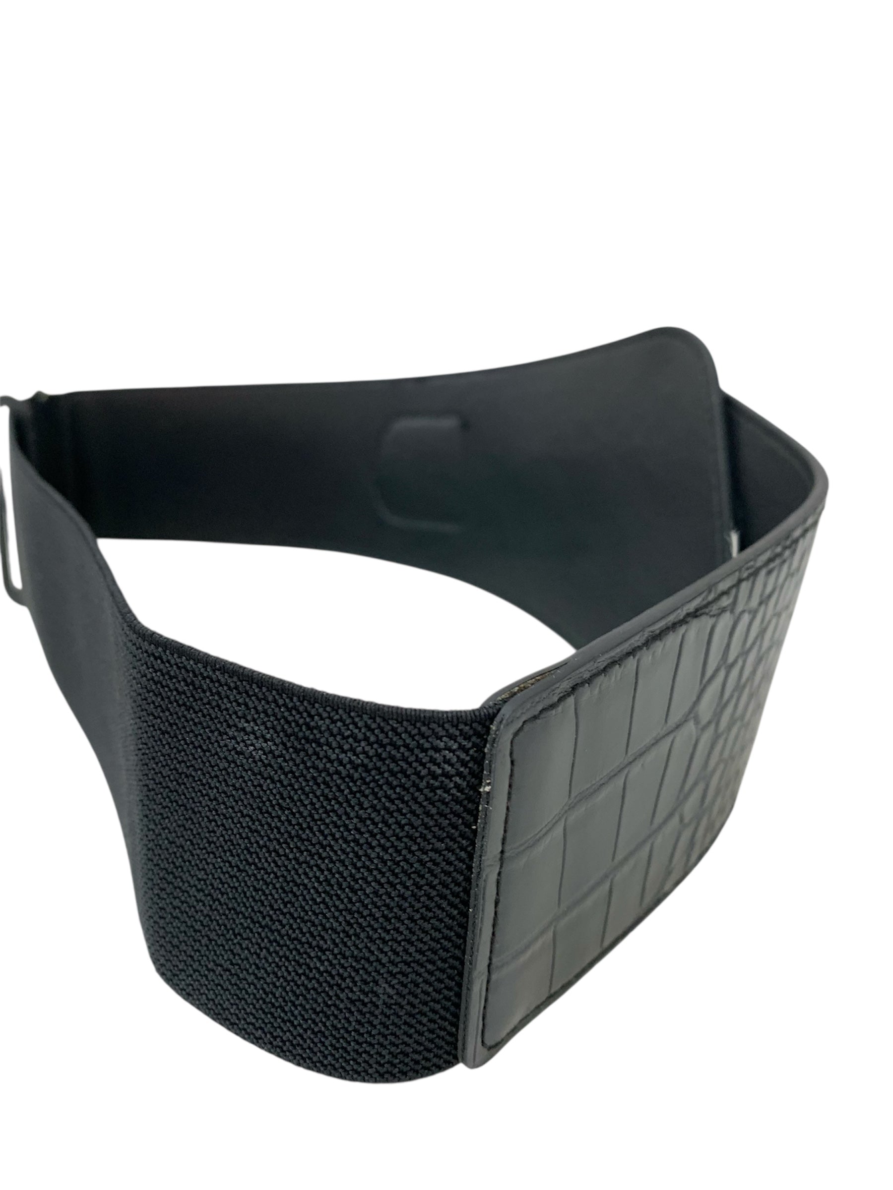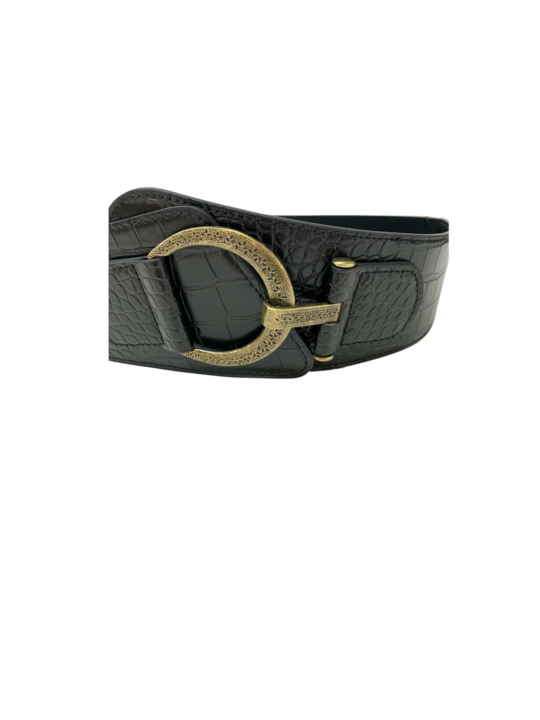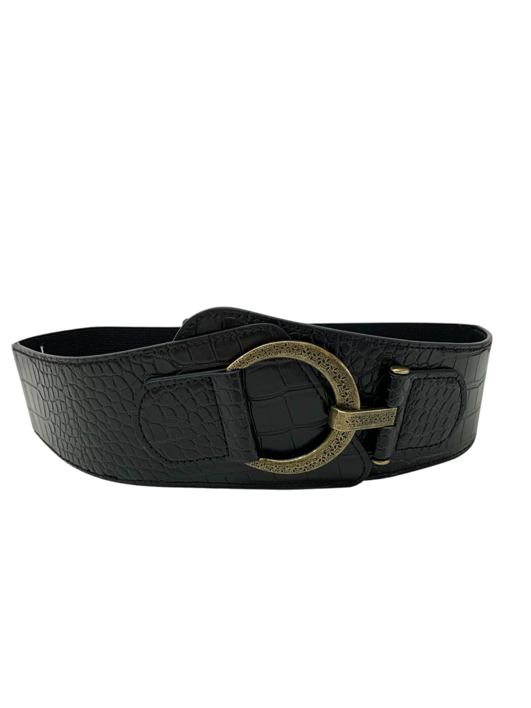 Cinturón de polipiel en color negro con textura tipo cocodrilo. Diseño ancho con hebilla metálica dorada envejecida de forma circular. Elástico parte posterior