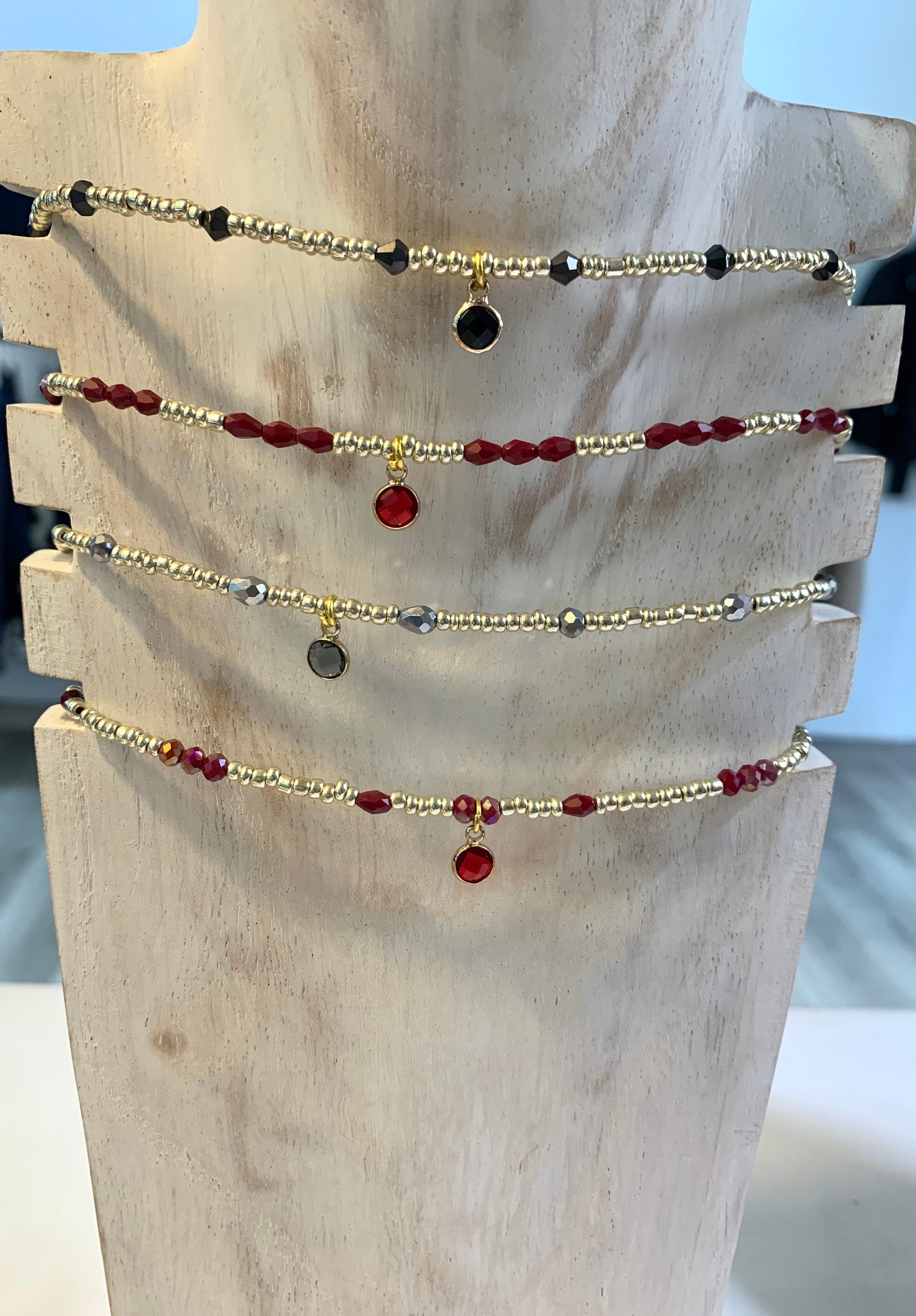 Collar corto de cuentas facetadas en negro combinadas con bolitas doradas y colgante central dorado con piedra en negro. Cierre con cadeneta ajustable.