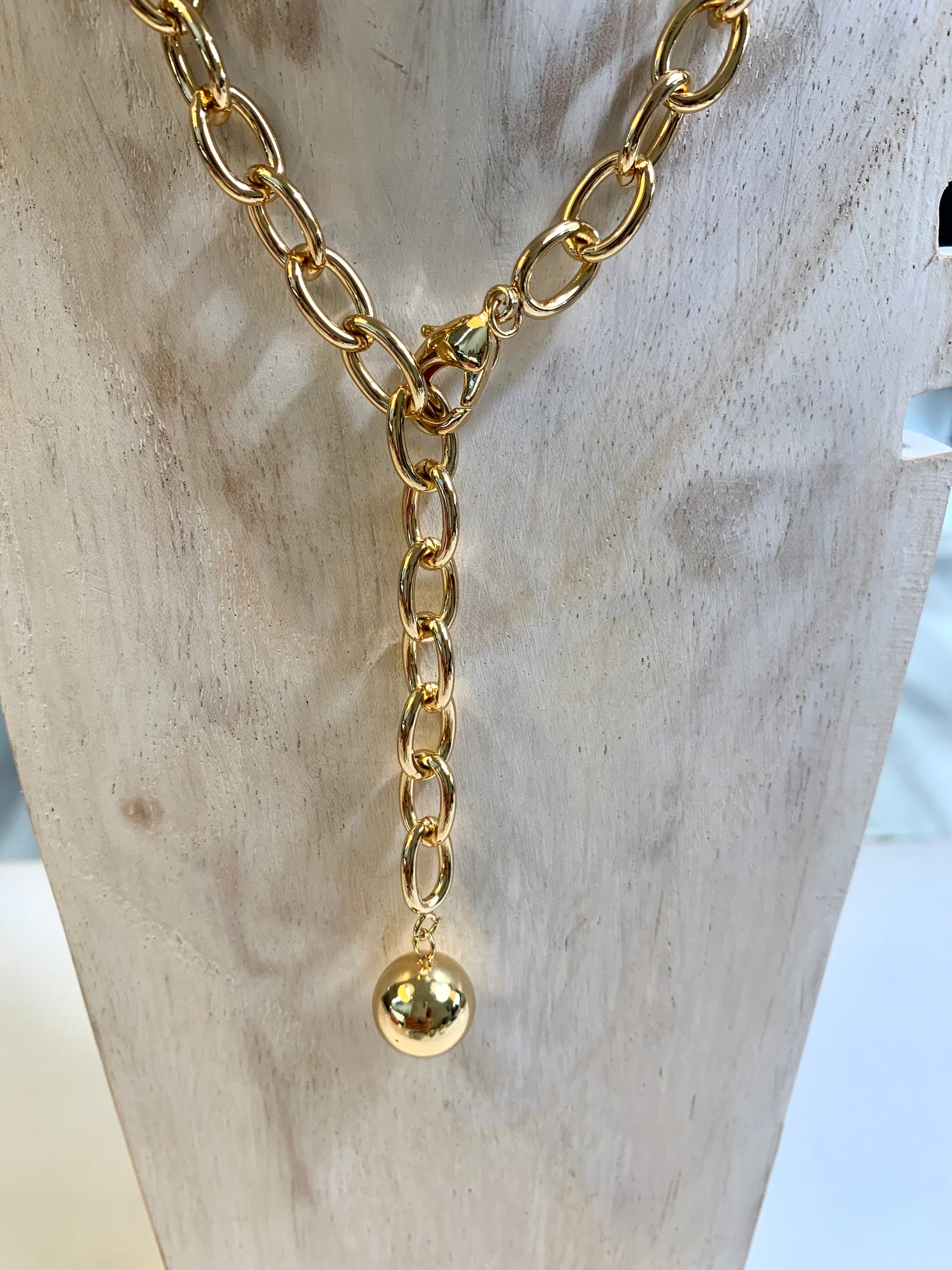 Collar largo, de cadena dorada de eslabones grandes con colgante de bola dorada. Cierre de pinza que permite darle la forma y longitud deseada.