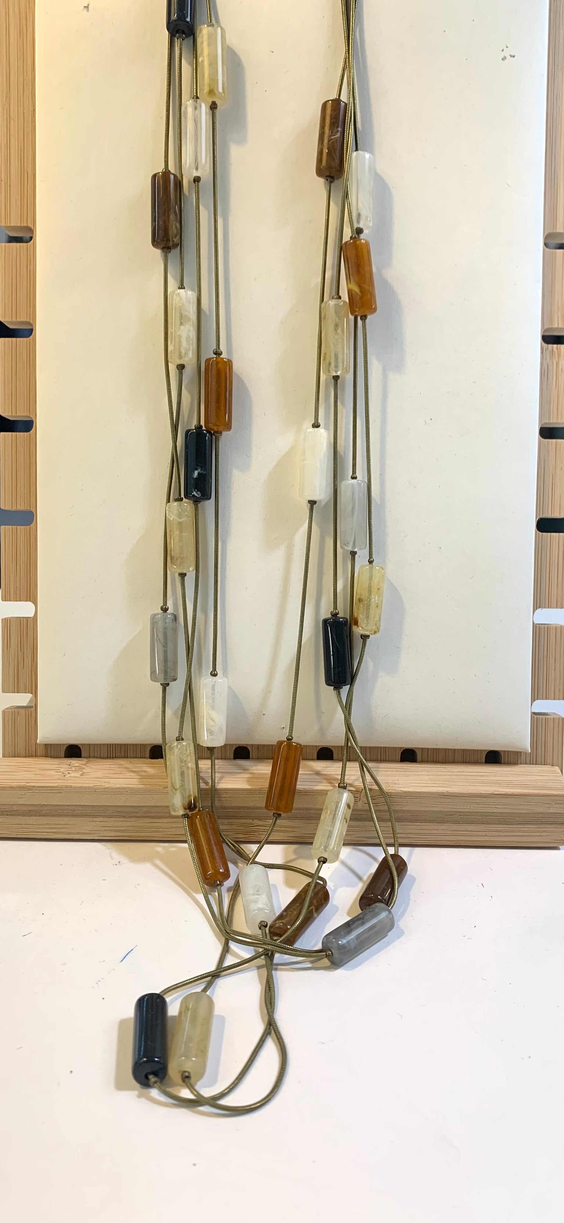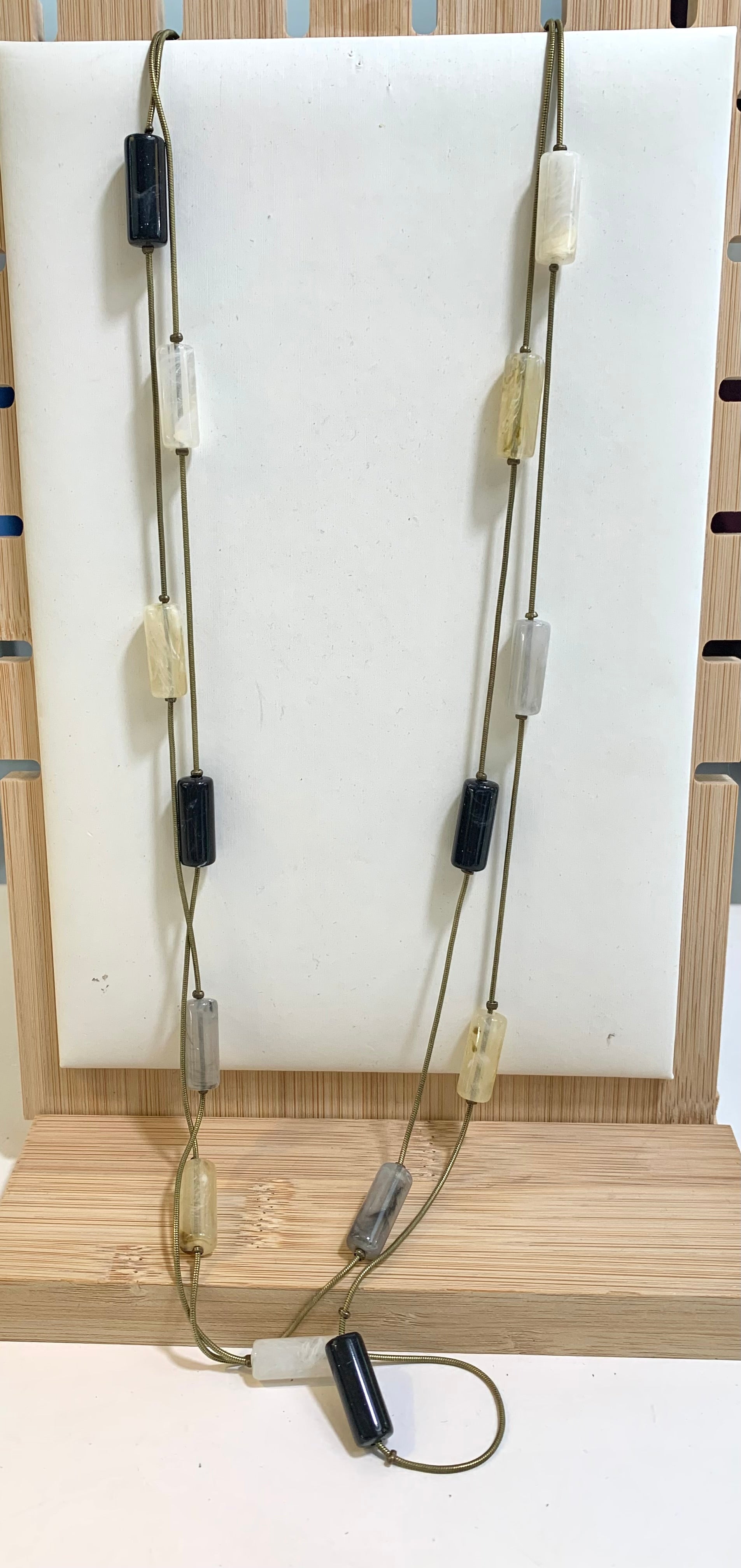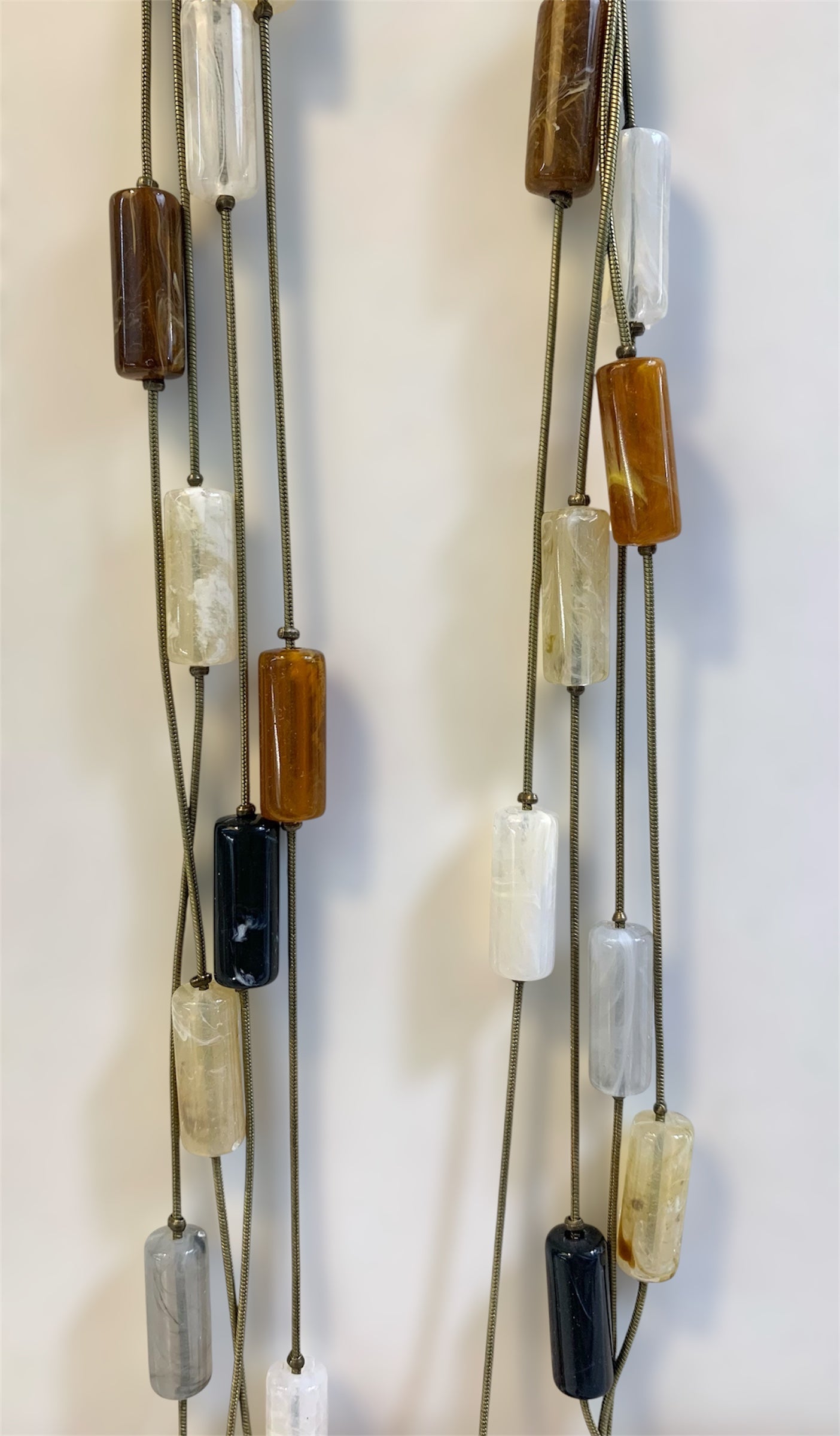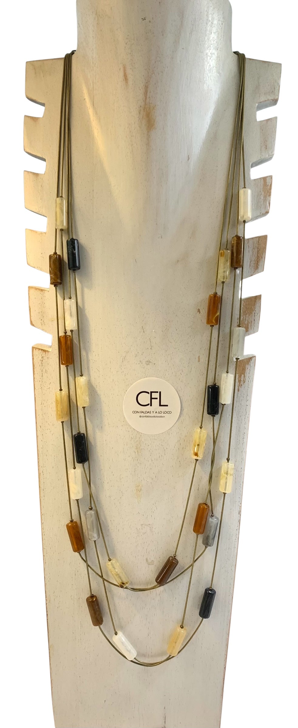 Collar largo de dos hilos de cobre con cuentas cilíndricas de resina que combina varios tonos neutros a elegir entre tonos tierra (chocolate-marfil-beige) o grises (gris-negro-beige).