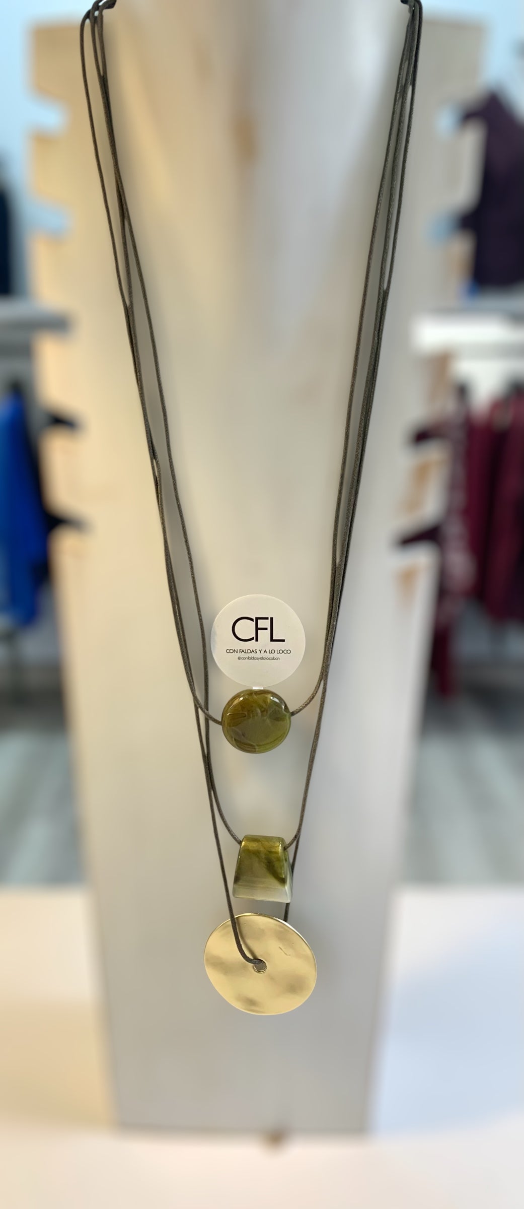 Collar largo, ligero, de cordón de algodón efecto cuero triple que combina una pieza de medalla dorada mate con piedras de resina en tonos verdes.