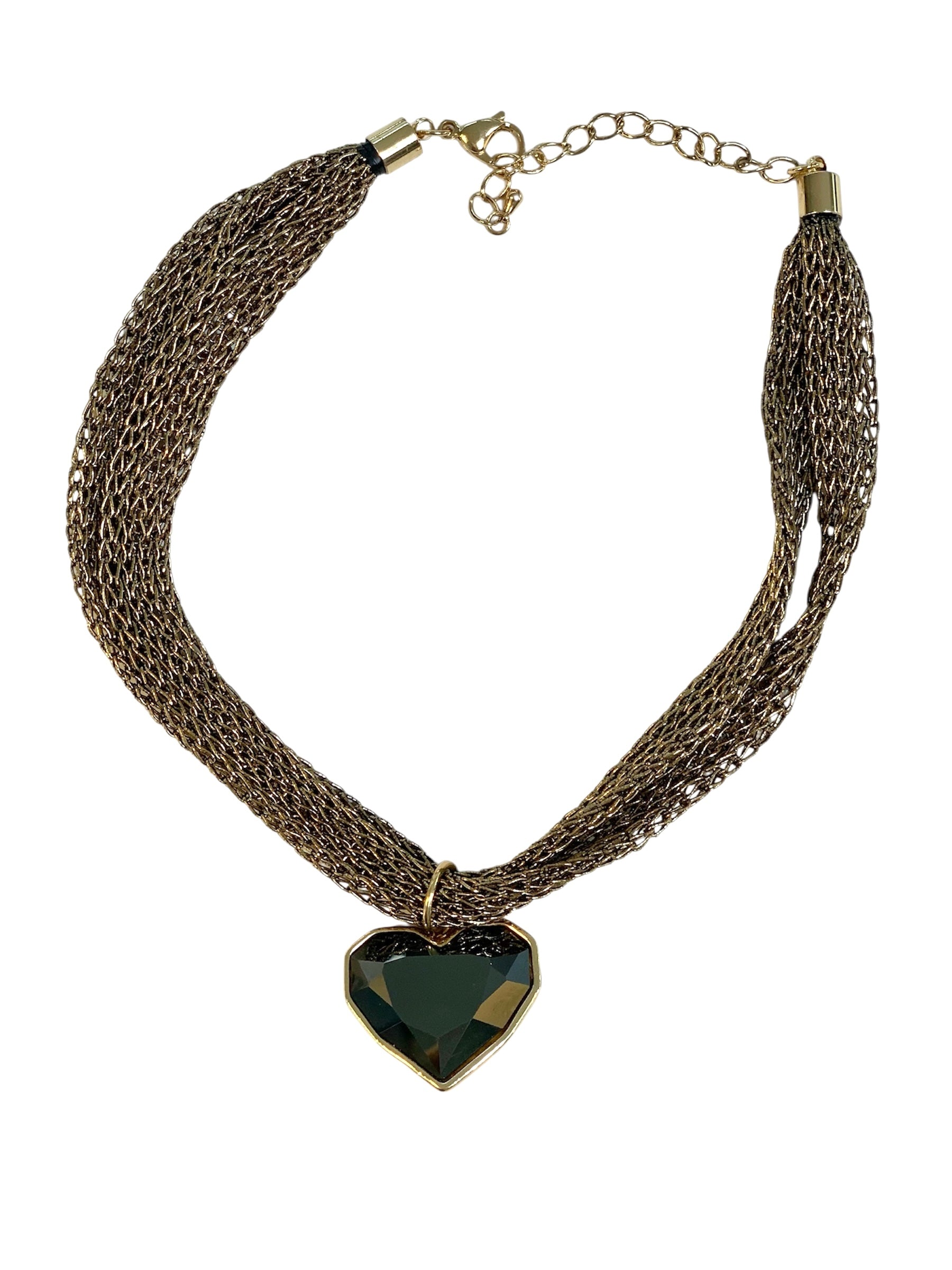 Collar con malla flexible en tono dorado envejecido que se ajusta cómodamente al cuello. Incluye un corazón con brillo tornasolado en tono plomo y un aro extraíble para añadir, intercambiar o combinar diferentes colgantes de la colección, adaptándose a tu estilo y ocasión. Cierre con cadeneta ajustable.