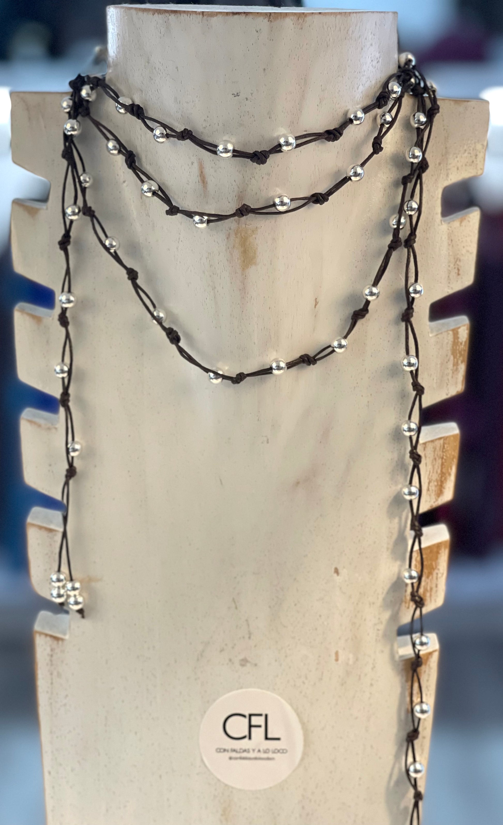 Hecho a mano con cuentas en tonos plata con hilo color chocolate de algodón trenzado efecto cuero. Ligero, versátil por su longitud y forma totalmente abierta.