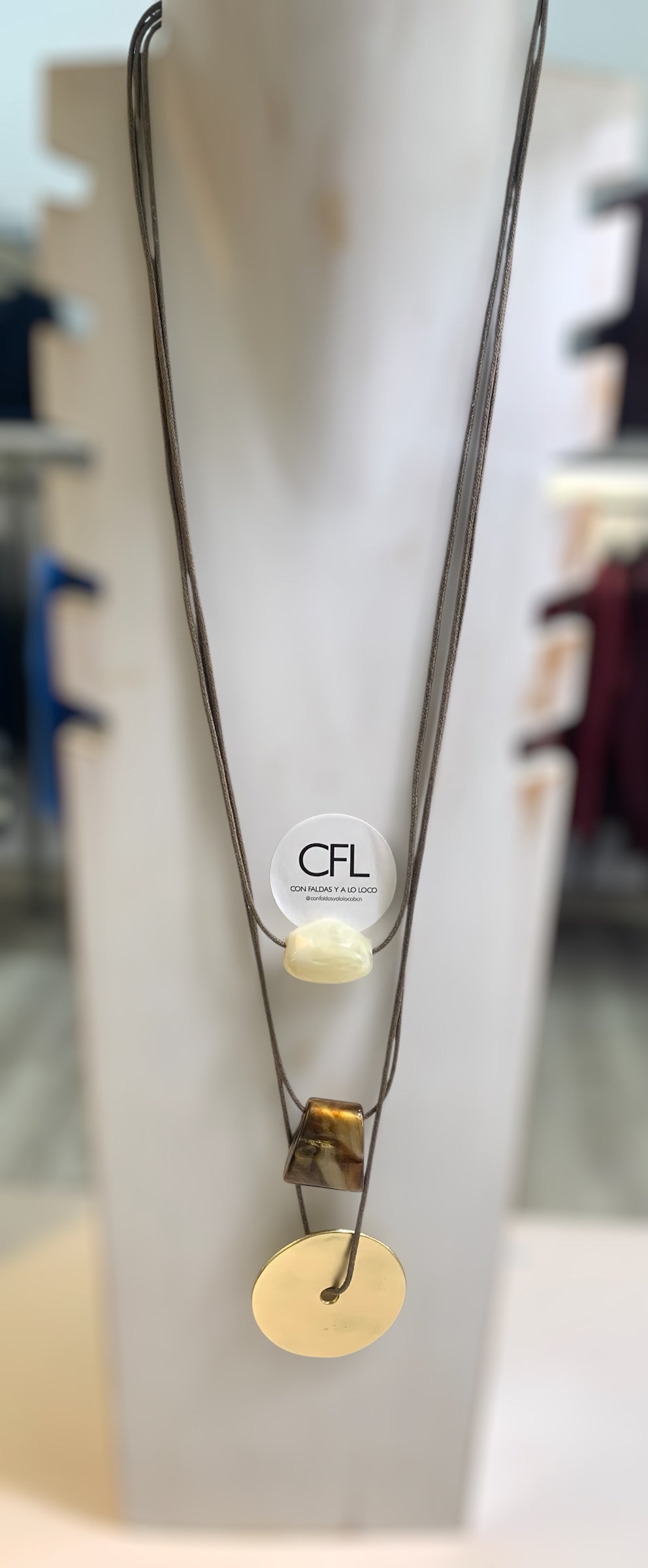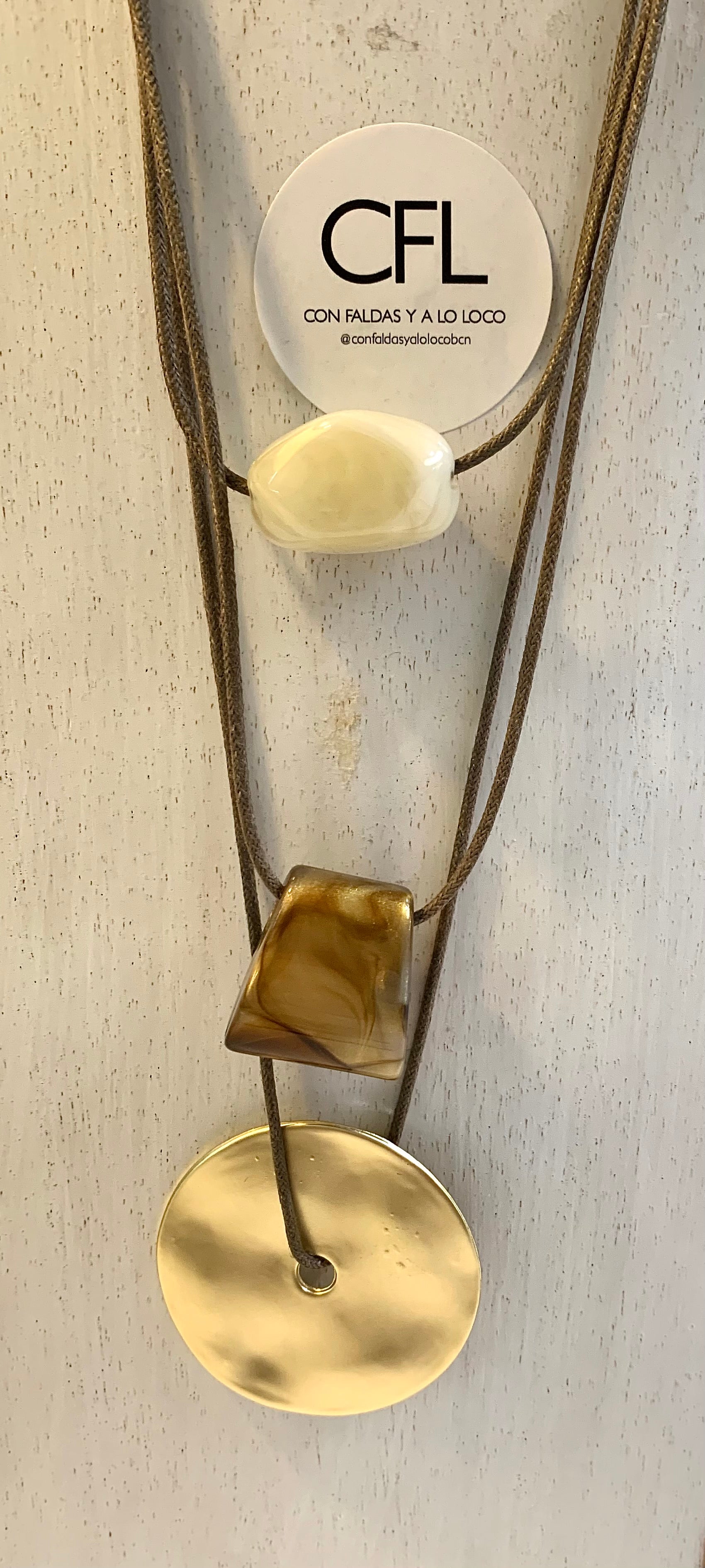 Collar largo, ligero, de cordón de algodón efecto cuero triple que combina una pieza de medalla dorada mate con piedras de resina en tono marrón y marfil.
