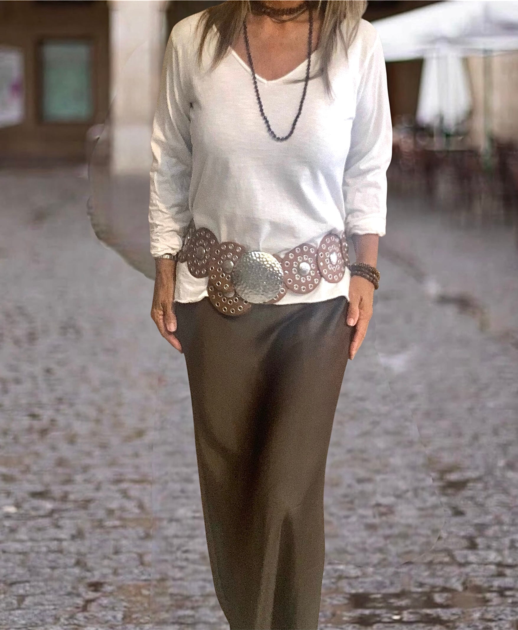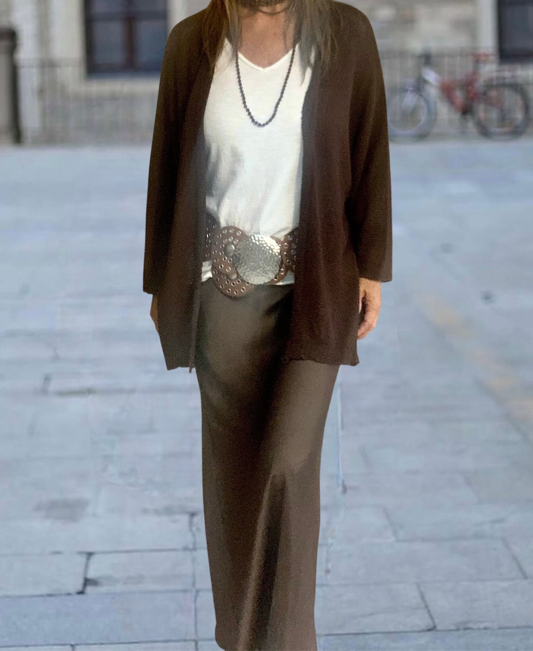 Falda midi de textura satén con corte al bies que se adapta al cuerpo con una caída suave y favorecedora. Cuenta con cintura elástica para mayor comodidad y ajuste