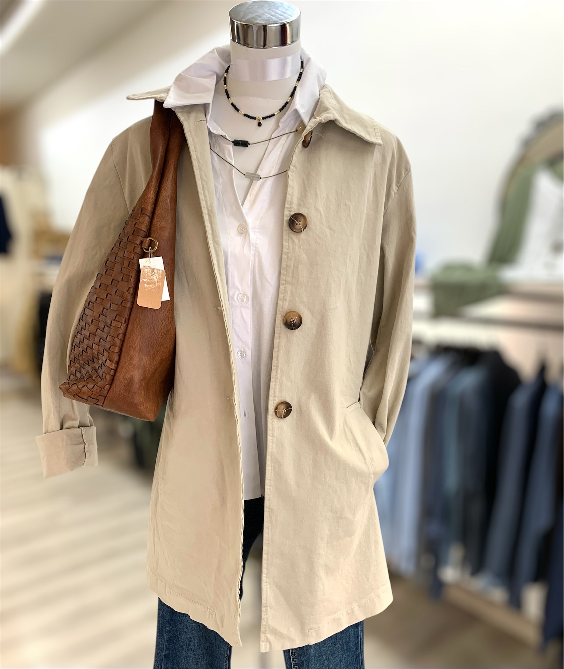 Gabardina tipo guardapolvo beige medida 3/4 , de corte recto con botones al frente y cuello clásico confeccionada en tejido de algodón.
