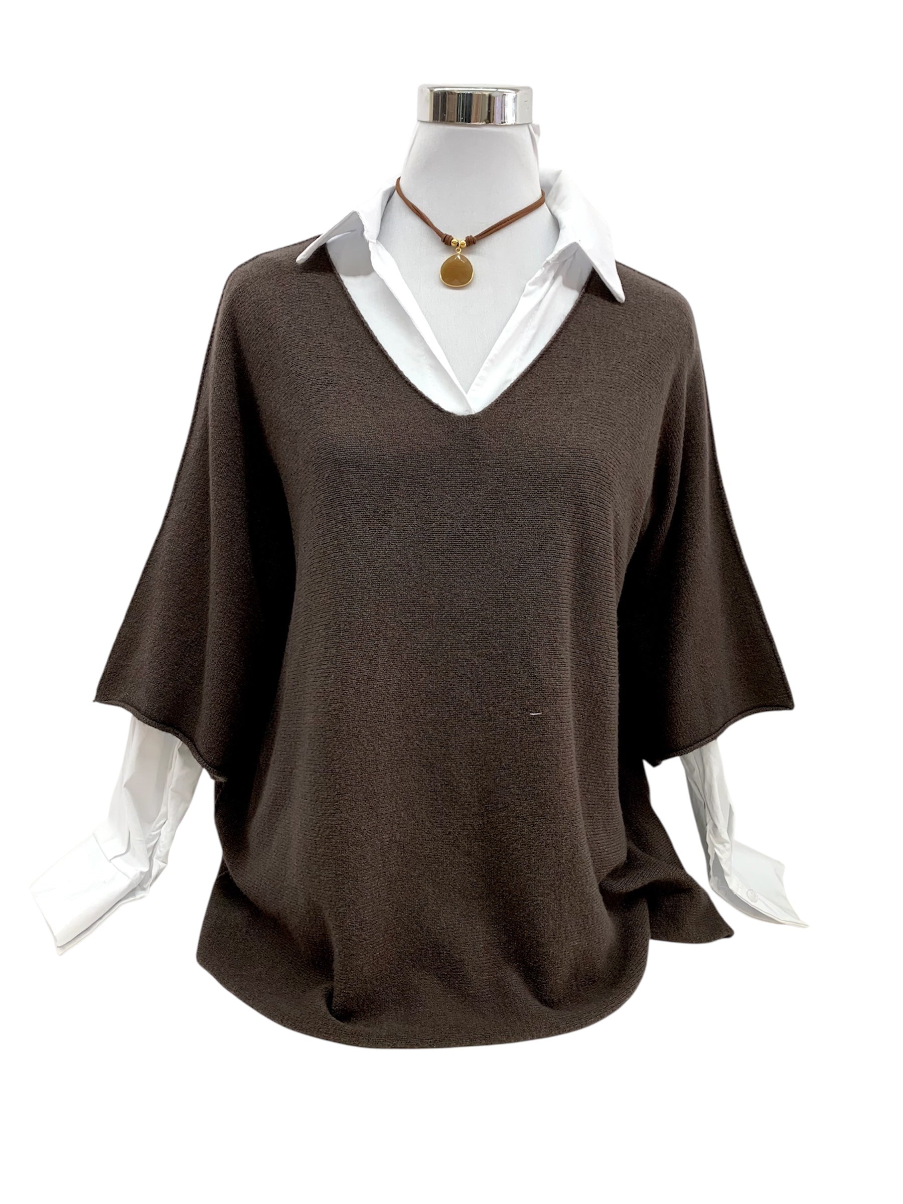 Jersey de punto con corte amplio y estilo oversize. Diseño de manga corta caída y escote en V, ideal para superponer sobre camisetas o camisas.
