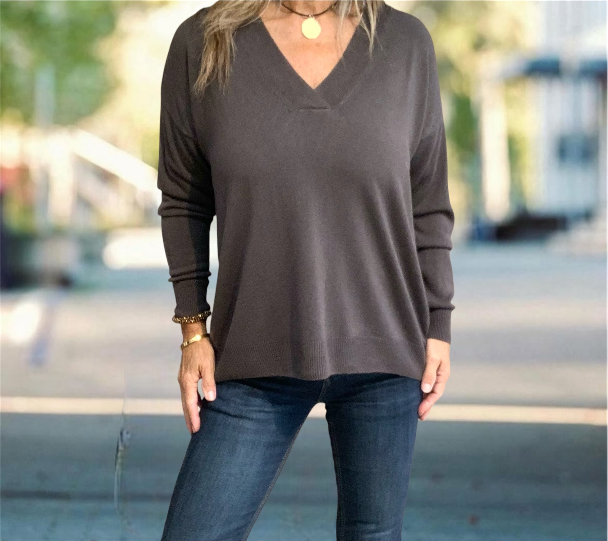 Jersey ligero de punto fino. Con escote en V y manga larga montada. Acabado en canalé ancho de 5 cms en escote, puños y bajos.