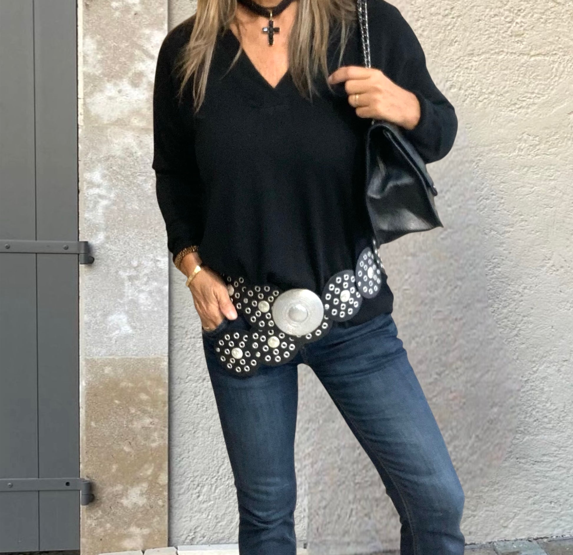 Jersey ligero de punto fino. Con escote en V y manga larga montada. Acabado en canalé ancho de 5 cms en escote, puños y bajos.