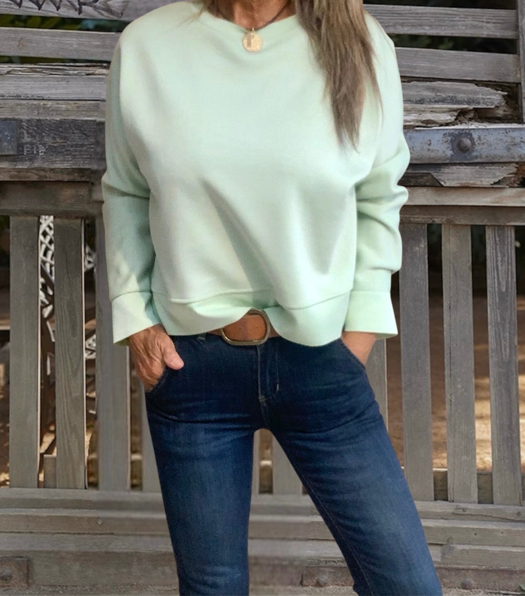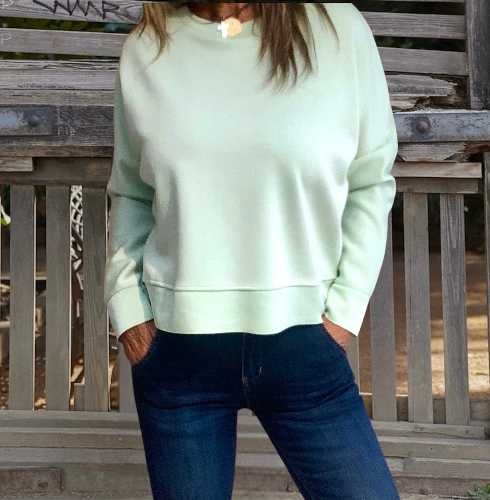 Jersey de color verde, ligero de textura suave y agradable, perfecto para entretiempo. Diseño con cuello redondo estilo sudadera, corte recto, manga larga sin montar y aberturas laterales en el bajo que aportan comodidad.