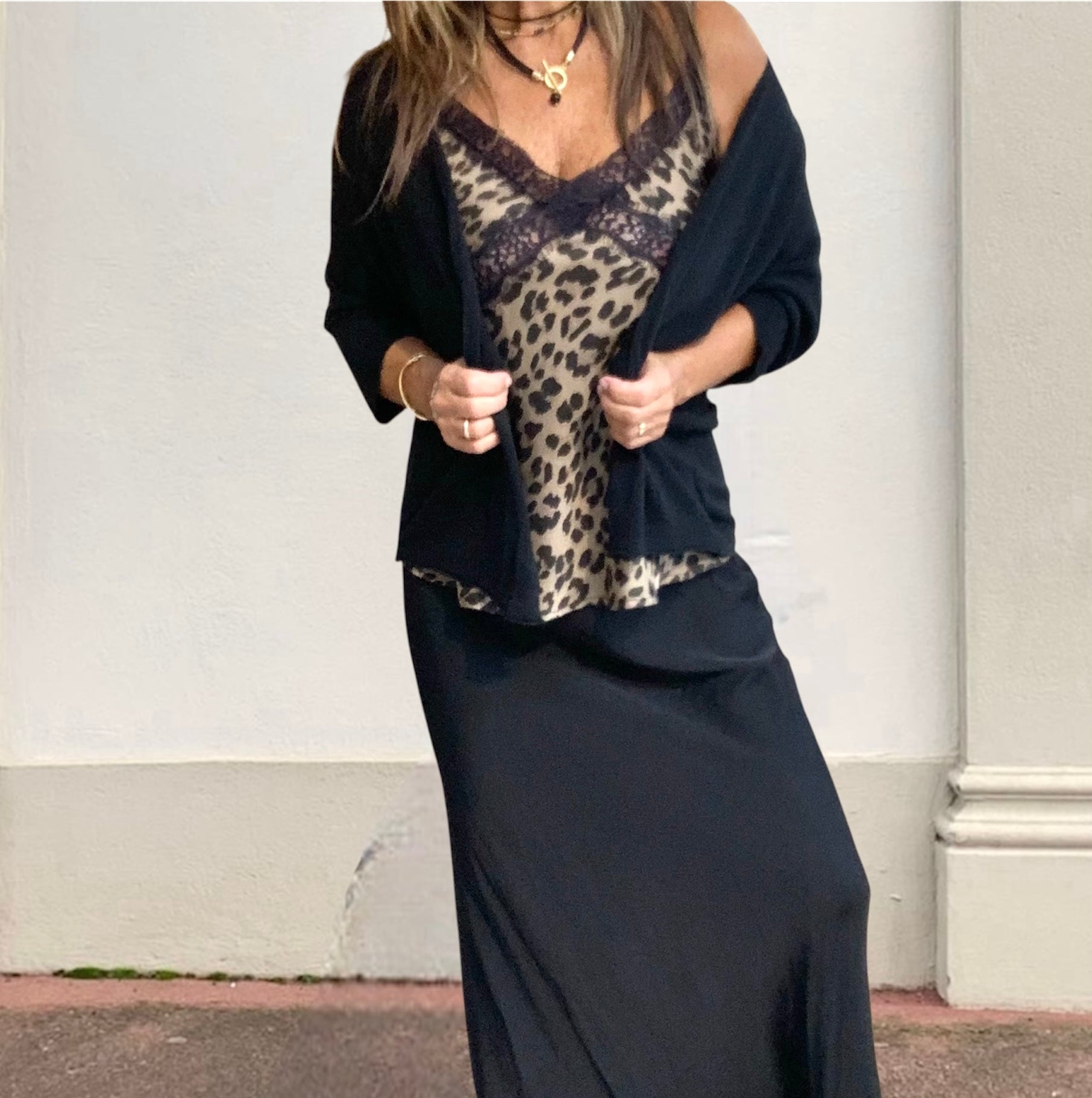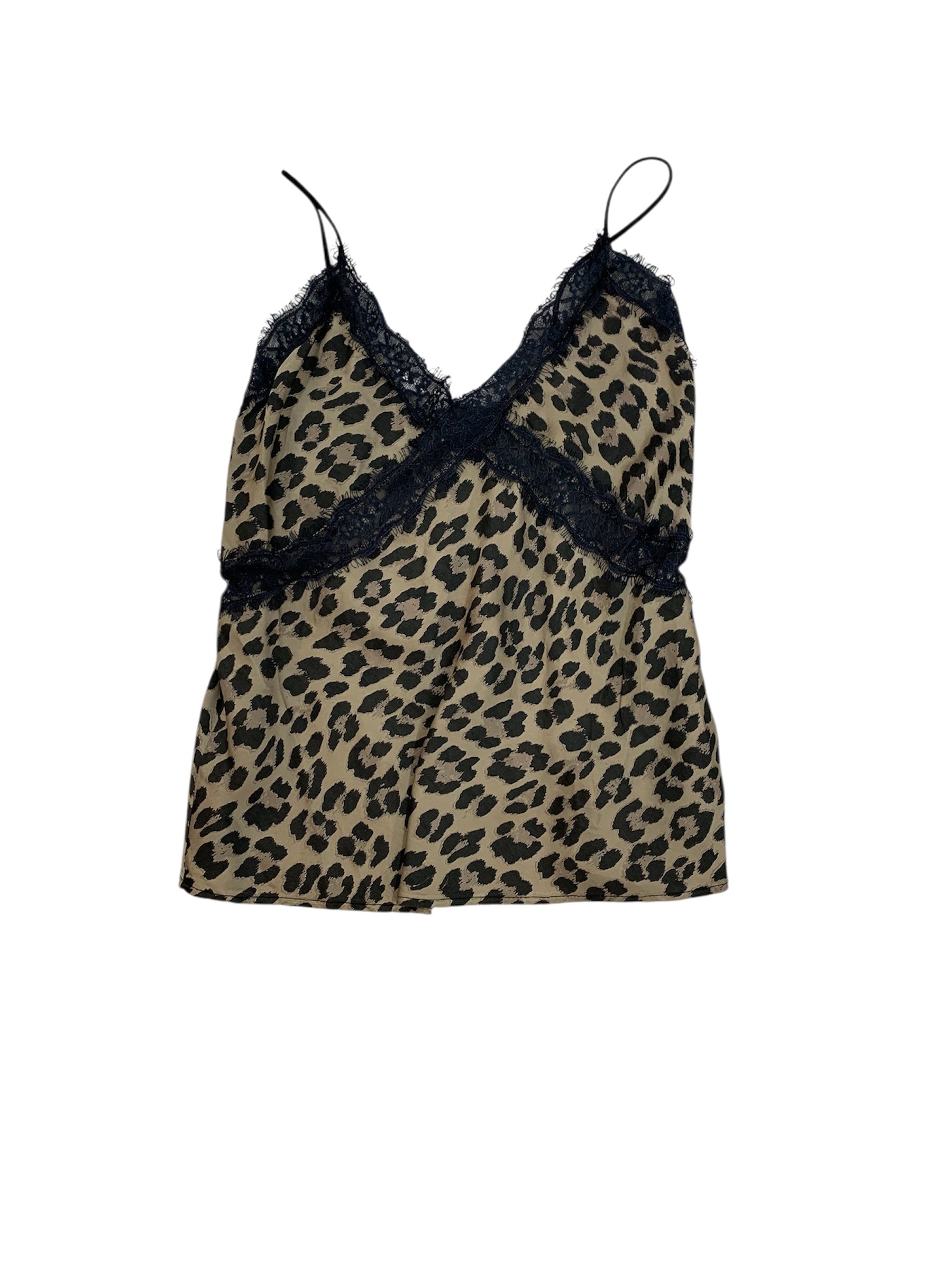 Top de tirantes finos graduables con estampado animal print, detalle de encaje negro y corte al bies que se ajusta suavemente al cuerpo.