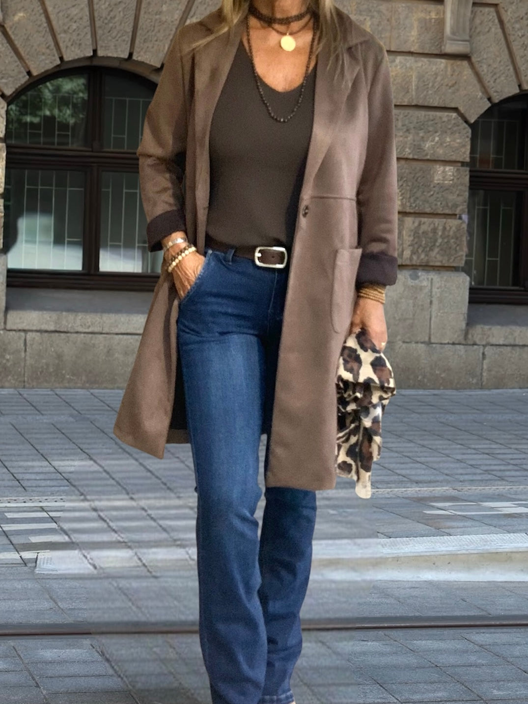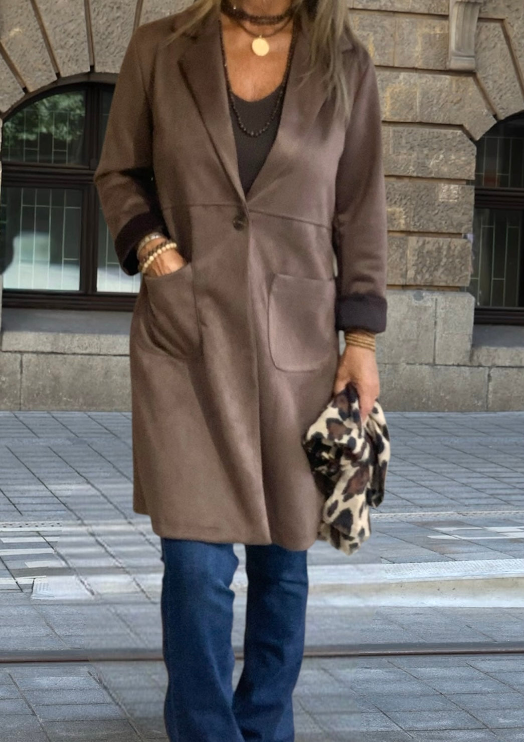 Levita de antelina tipo abrigo suave semi/elástica con solapa clásica y cierre de un botón. Bolsillos delanteros amplios y manga larga con vuelta en contraste. Corte recto y ligero, perfecta para entretiempo.