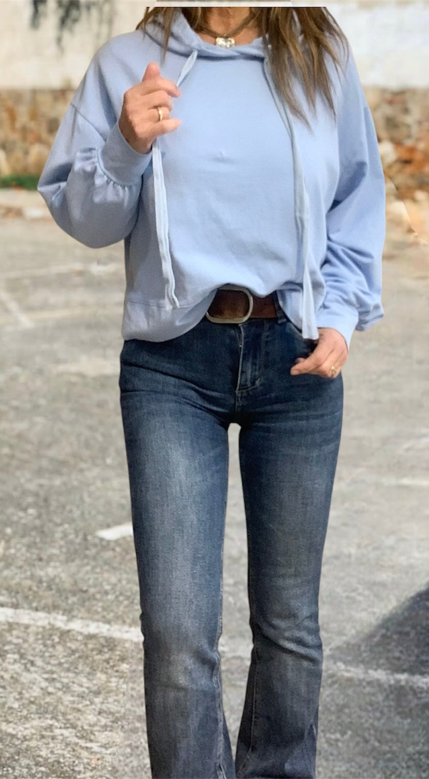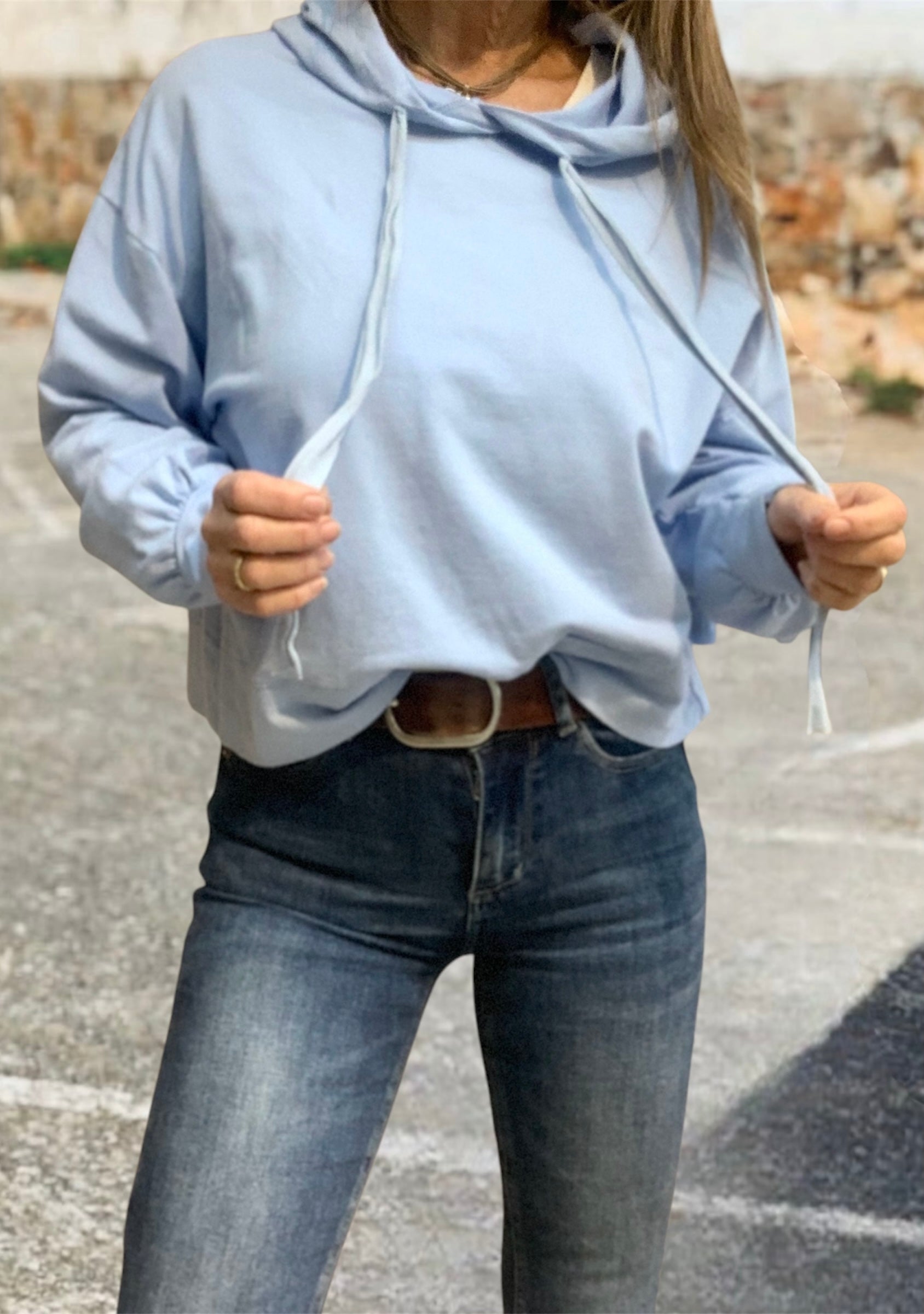 Jersey casual tipo sudadera con capucha, confeccionado en algodón de textura agradable con ligero toque elástico. Manga larga, ligeramente fruncida en puños y cintura, que llega a la altura de la cadera.